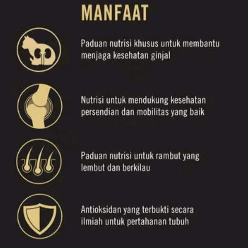 ·Dukung Kesehatan Ginjal: Formula Optirenal membantu memperbaiki fungsi ginjal dan memperlambat proses penuaan ginjal pada kucing dewasa.