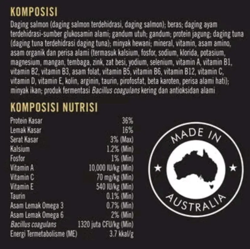 ·Kesehatan Pencernaan & Imunitas: Probiotik aktif memperkuat daya tahan tubuh dan kesehatan pencernaan kucing.