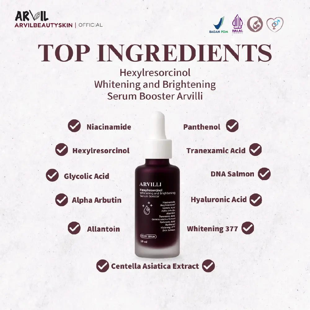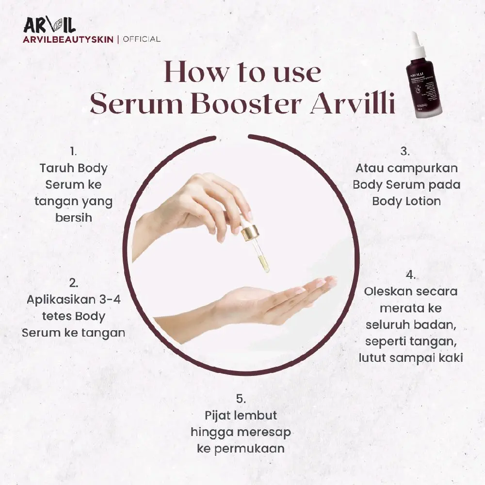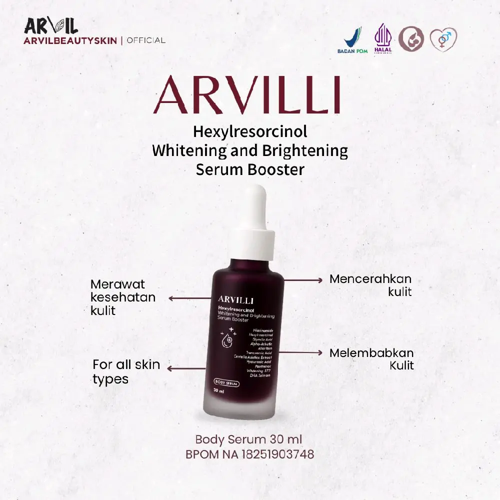 Body serum booster arvilli dapat merawat kesehatan kulit kalian, selain itu juga bisa mencerahkan dan melembabkan kulit.