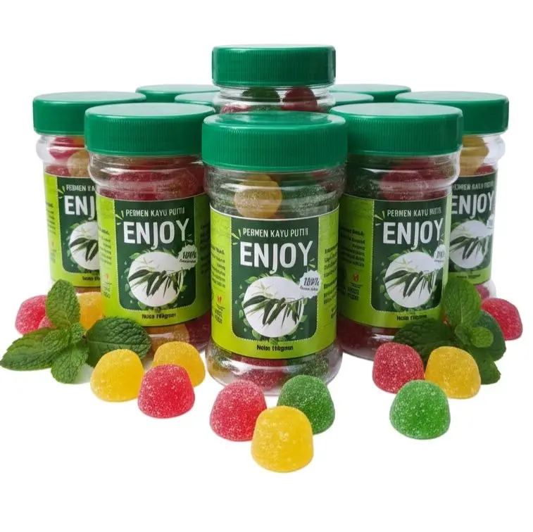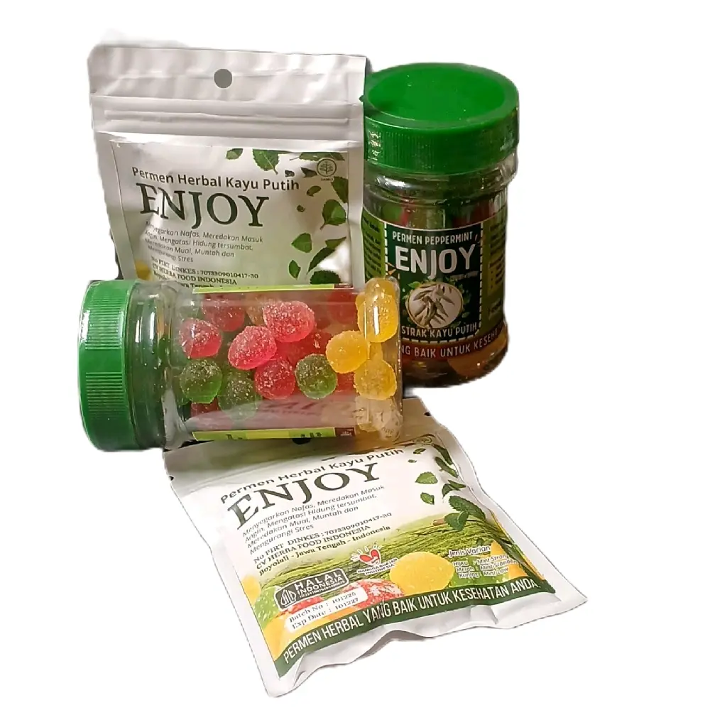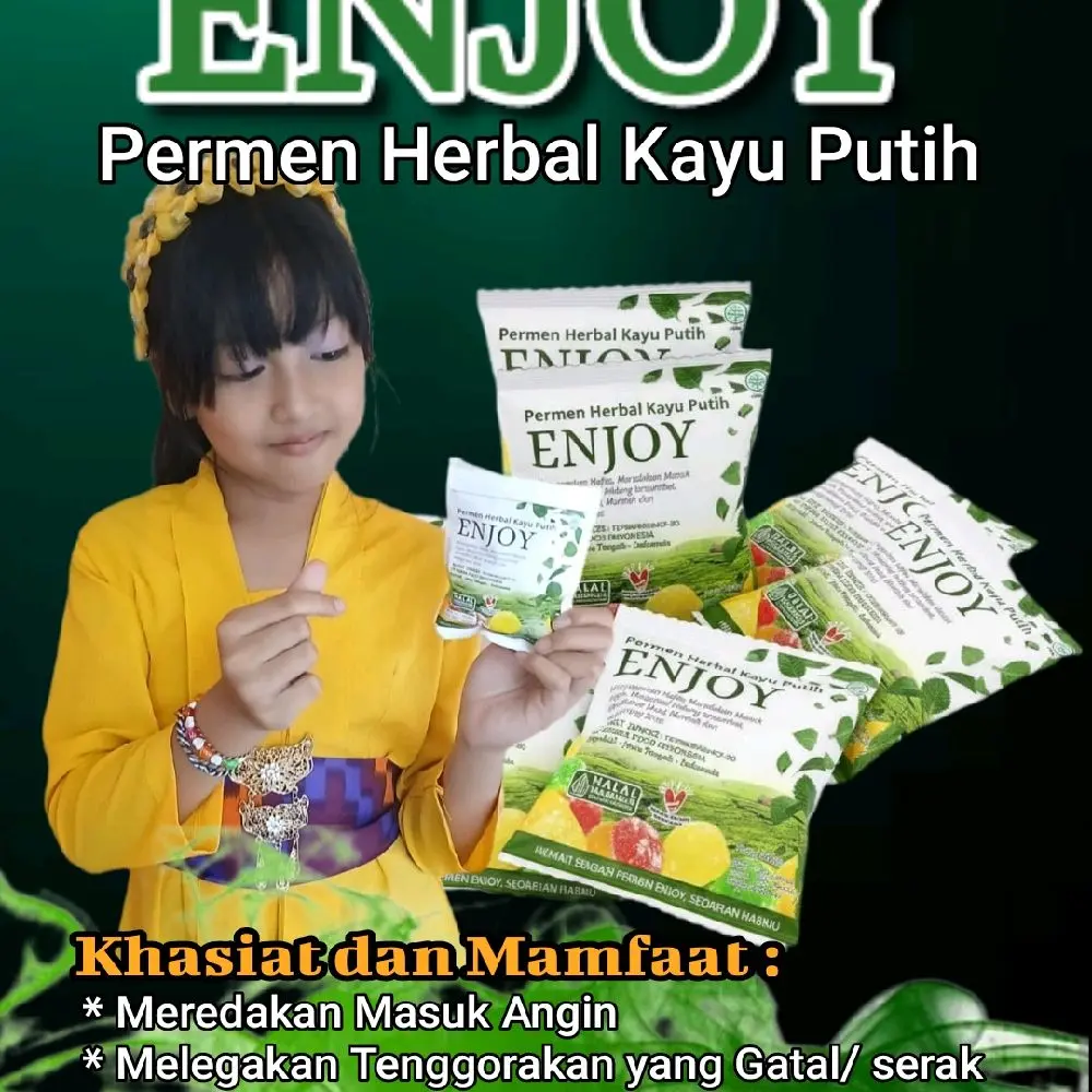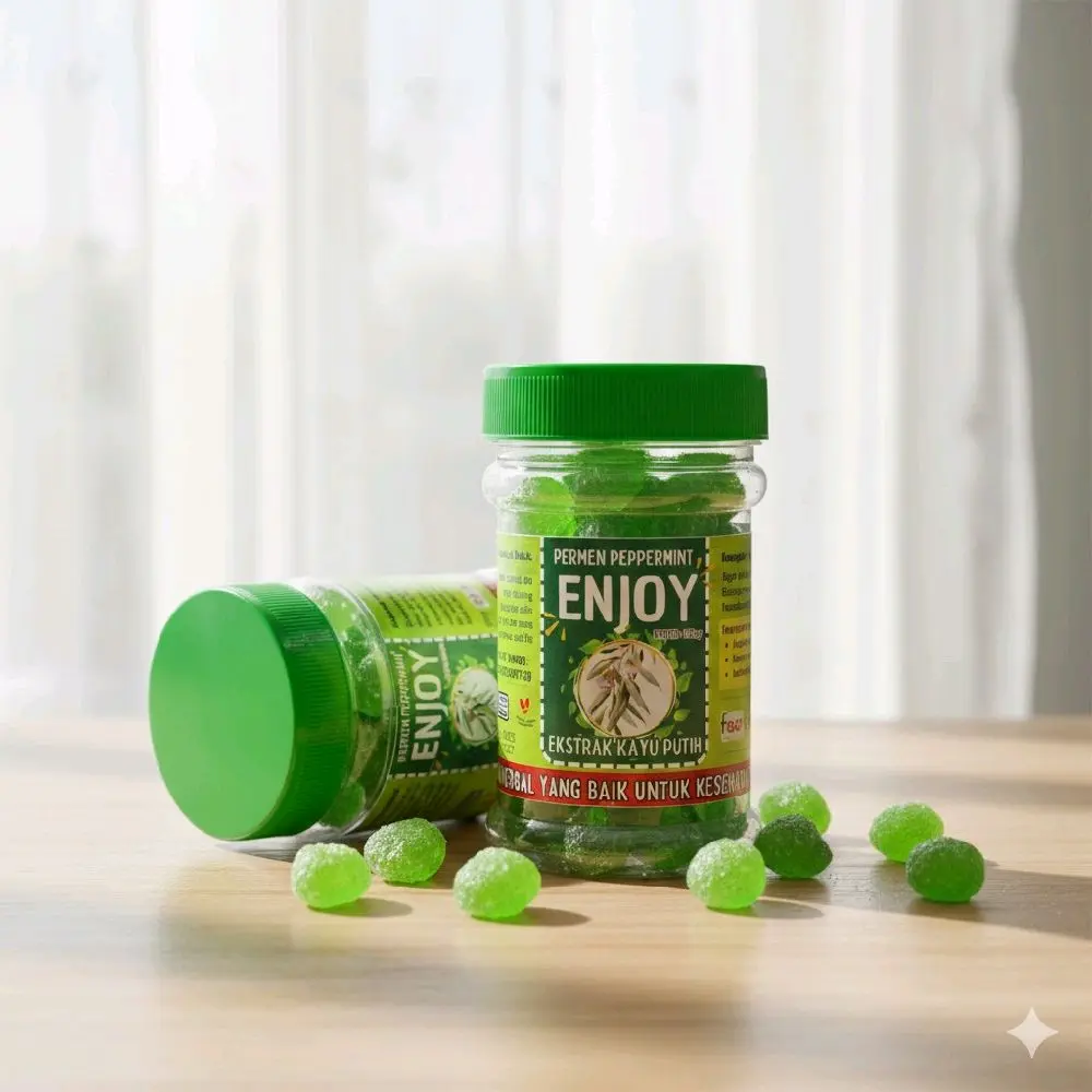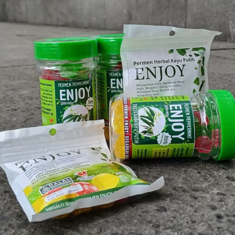 Permen herbal kayu putih, permen kesehatan ENJOY adalah permen yang memiliki banyak khasiat : melegakan tenggorokan, masuk angin, perut kembung dan mual mual,hidung tersumbat, tenggorokan terasa gatal atau ingin muntah perjalanan dll