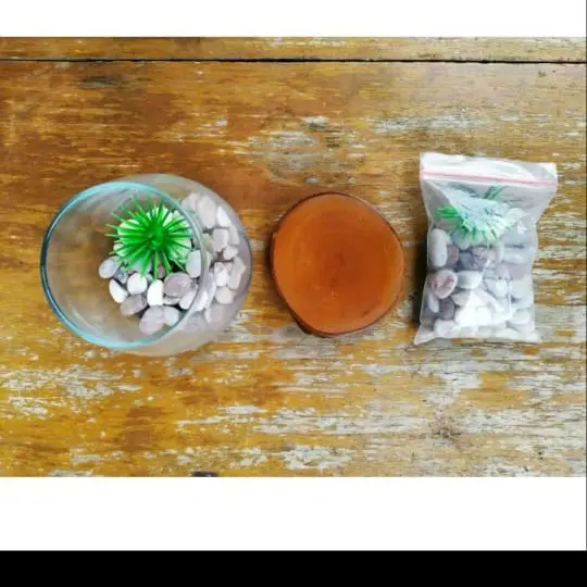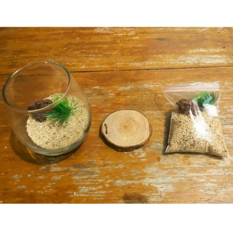9cm, dan tinggi 10cm. Fullset termasuk aquarium, tatakan kayu, batu alam, dan
