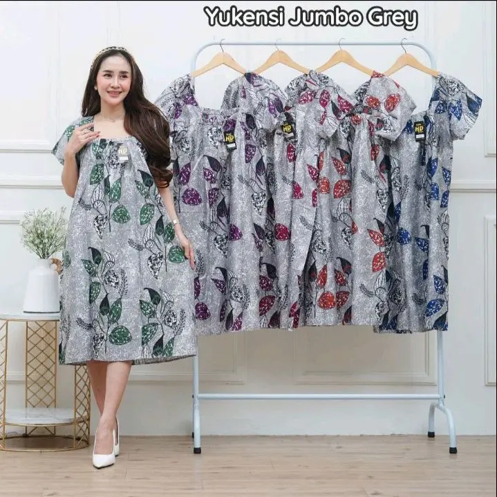 DAPAT! 2 DASTER BAHAN LEMBUT/ Yukensi Jumbo Grey - Gaun Batik Wanita Elegan dengan Motif Daun dan Warna Abu-abu