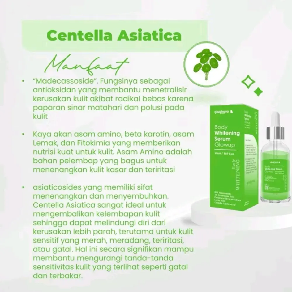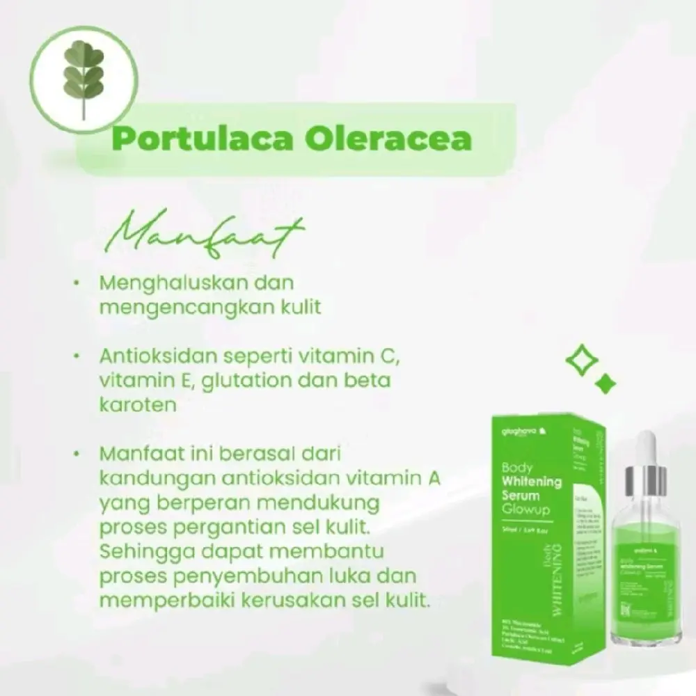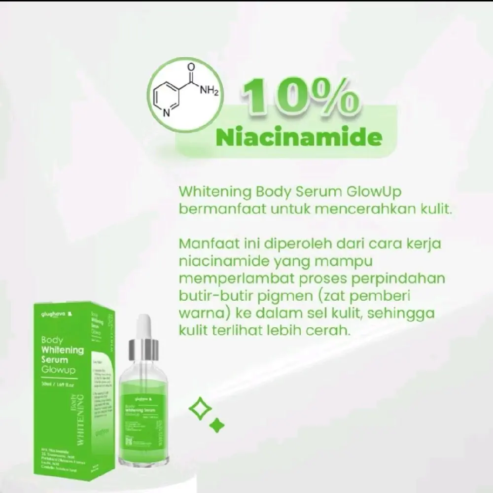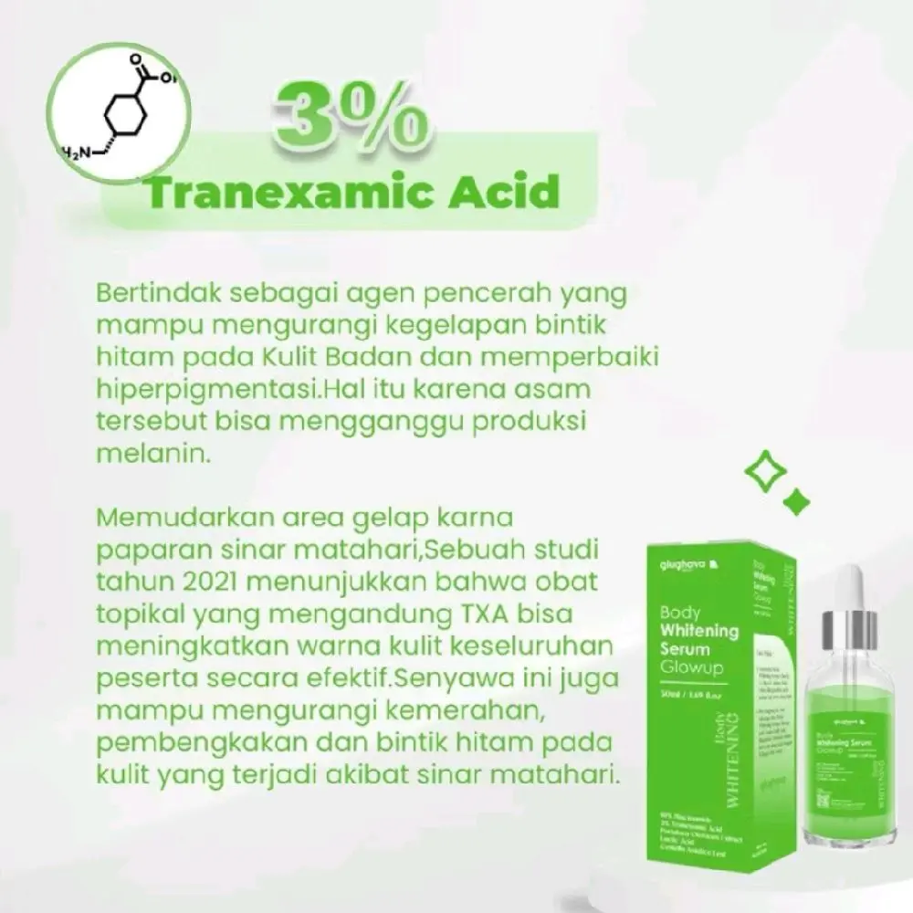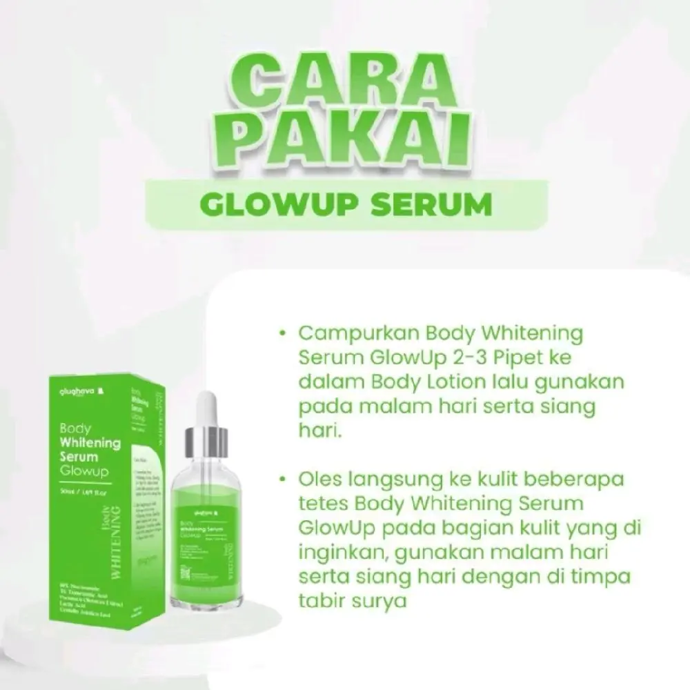 Body Whitening Serum GlowUp adalah produk perawatan kulit yang dapat membantu mencerahkan kulit gelap dan meratakan warna kulit. Produk ini mengandung 10% Niacinamide dan 3% Tranexamic Acid yang dapat membantu meningkatkan warna kulit yang diinginkan.