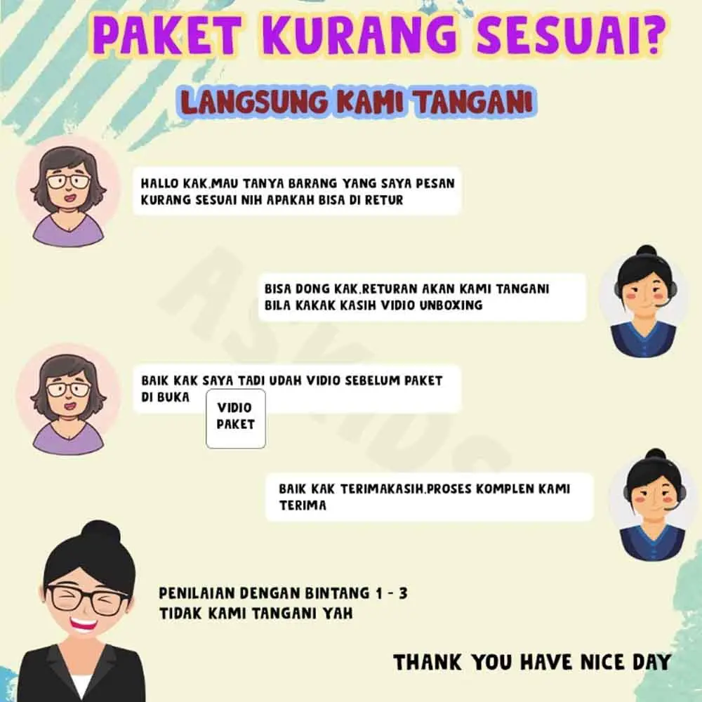 - Harap sertakan Video Unboxing pada saat Complain, di luar itu kami tidak menerima Complain. Apabila di chat lebih dari 2 hari tidak di balas untuk konfirmasi barang yang kosong, barang kita kirim Random ya. Terimakasih!