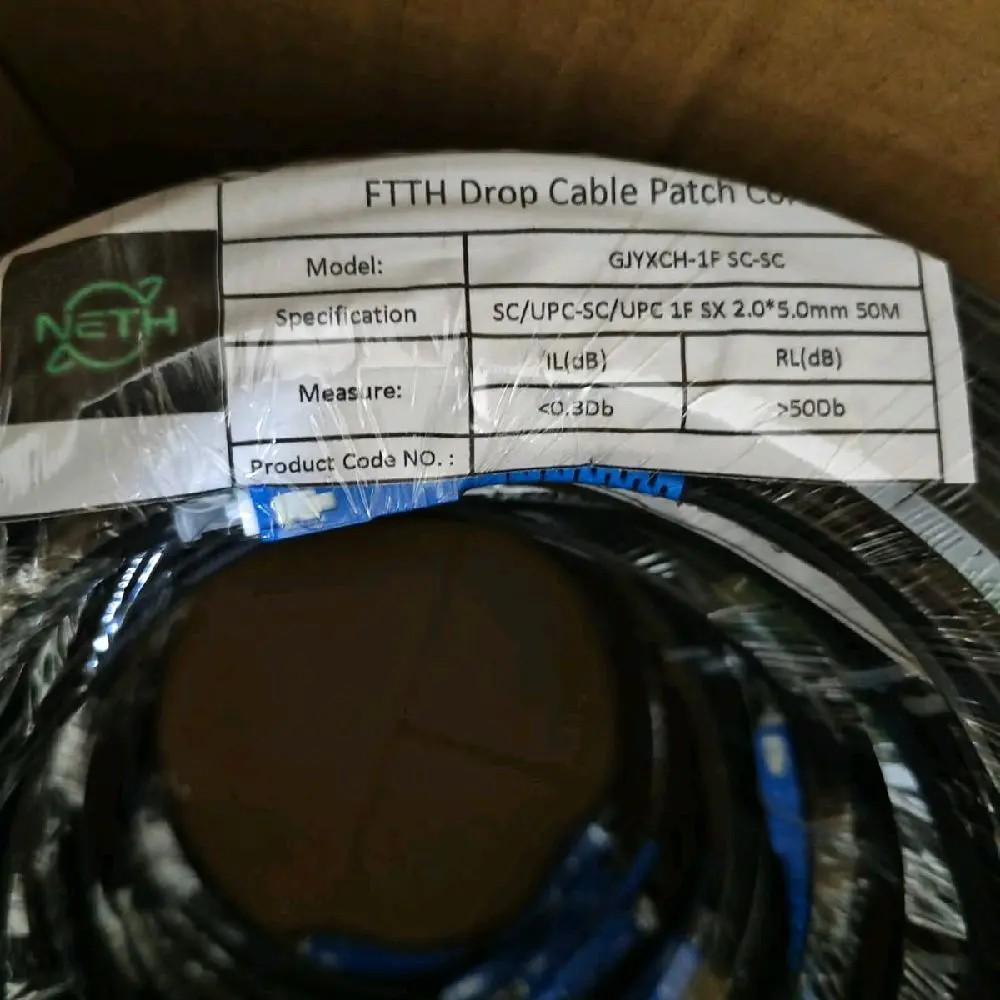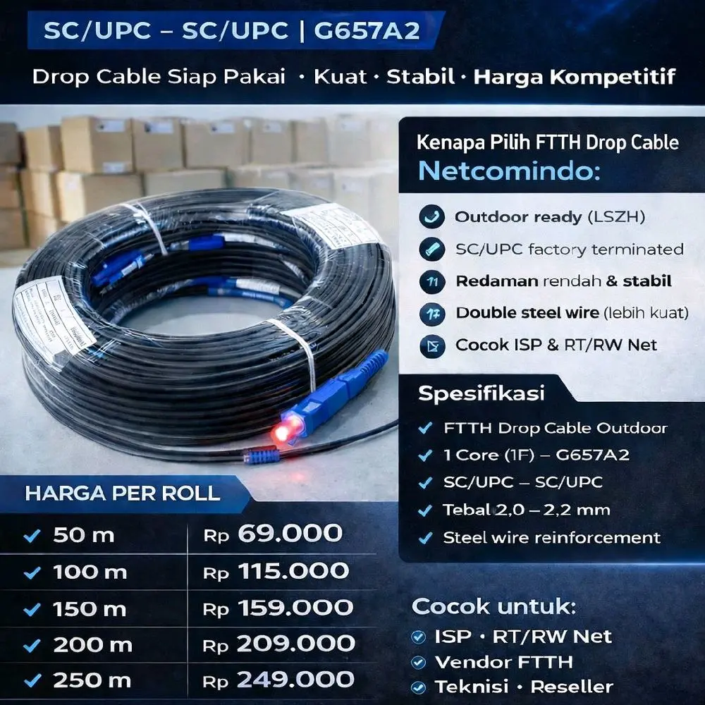 Netcomindo hadir dengan kabel fiber optic FTTH berkualitas tinggi untuk instalasi jaringan rumah, gedung, dan proyek ISP. Dirancang khusus untuk penggunaan luar ruangan, kabel ini menggunakan serat G657A2 dengan konektor SC/UPC–SC/UPC yang presisi. 🌟