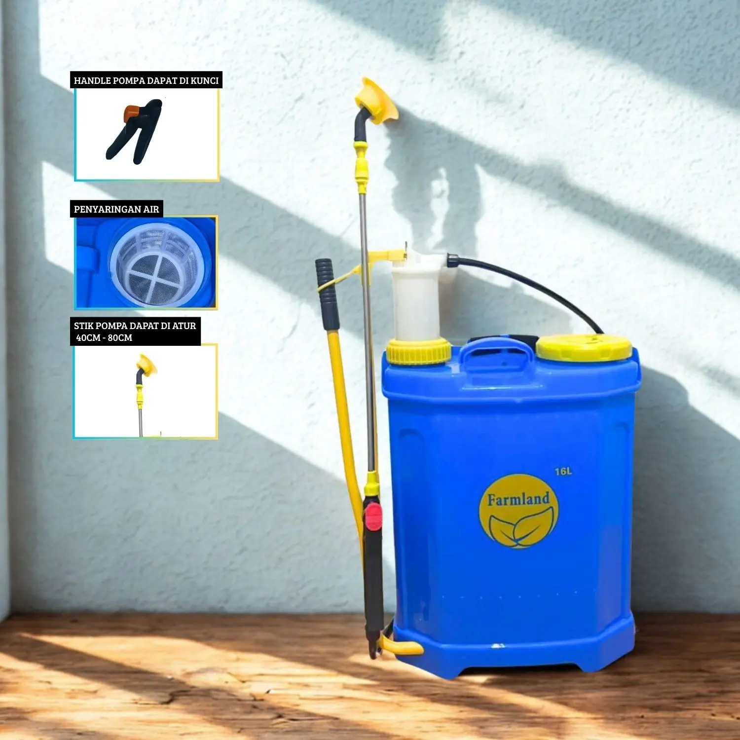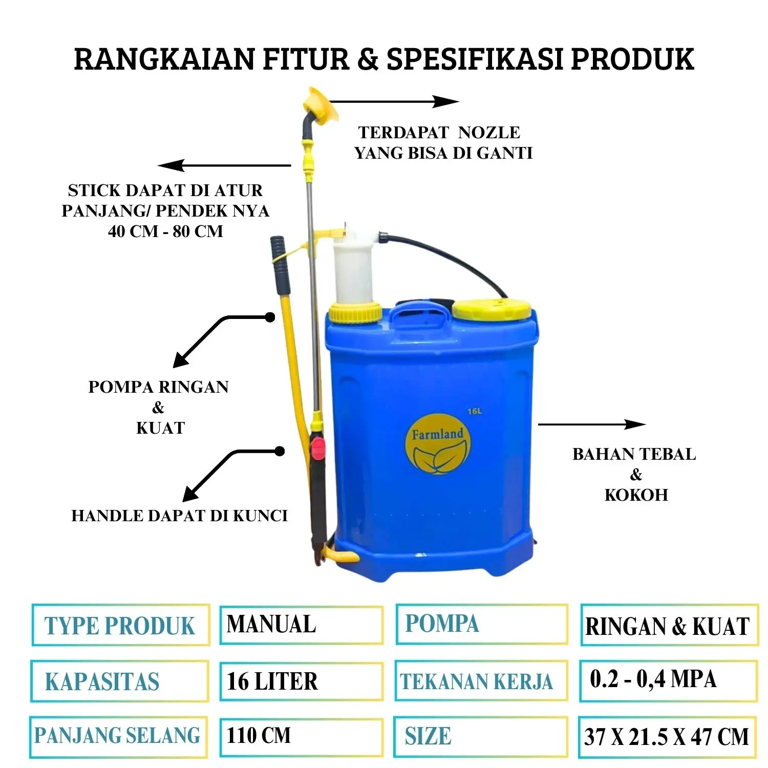 Dengan tekanan kerja 0,2 – 0,4 MPA dan tuas pompa ergonomis, Anda bisa menghasilkan semprotan merata untuk pupuk, pestisida, atau cairan pembersih. Stick semprot dapat diatur panjang-pendeknya, dilengkapi nozzle yang bisa diganti, sehingga fleksibel untuk berbagai kebutuhan.