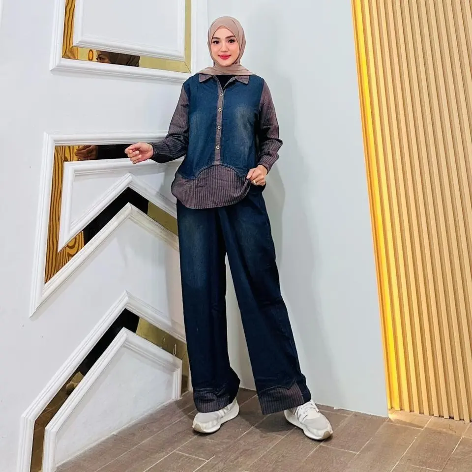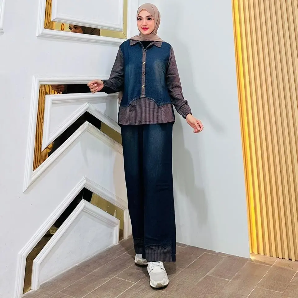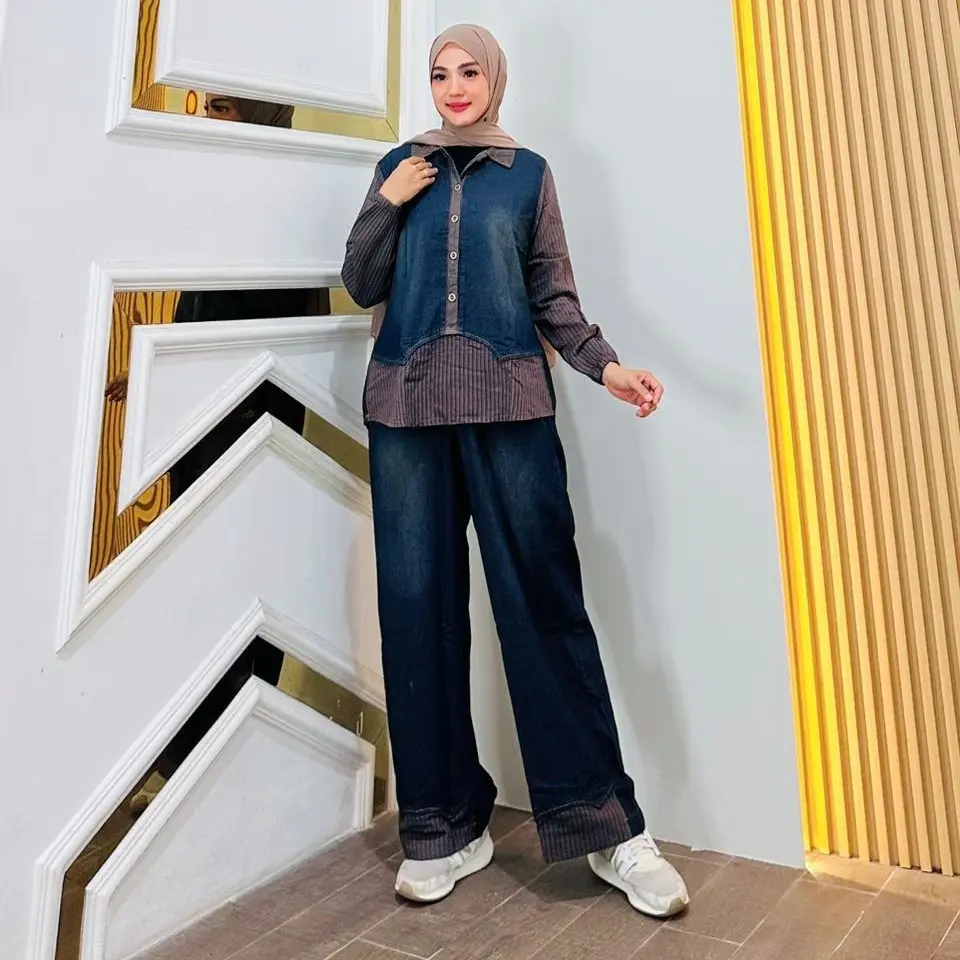 Meiko One Set Celana Jeans Salur Fashion Muslim Wanita Kekinian