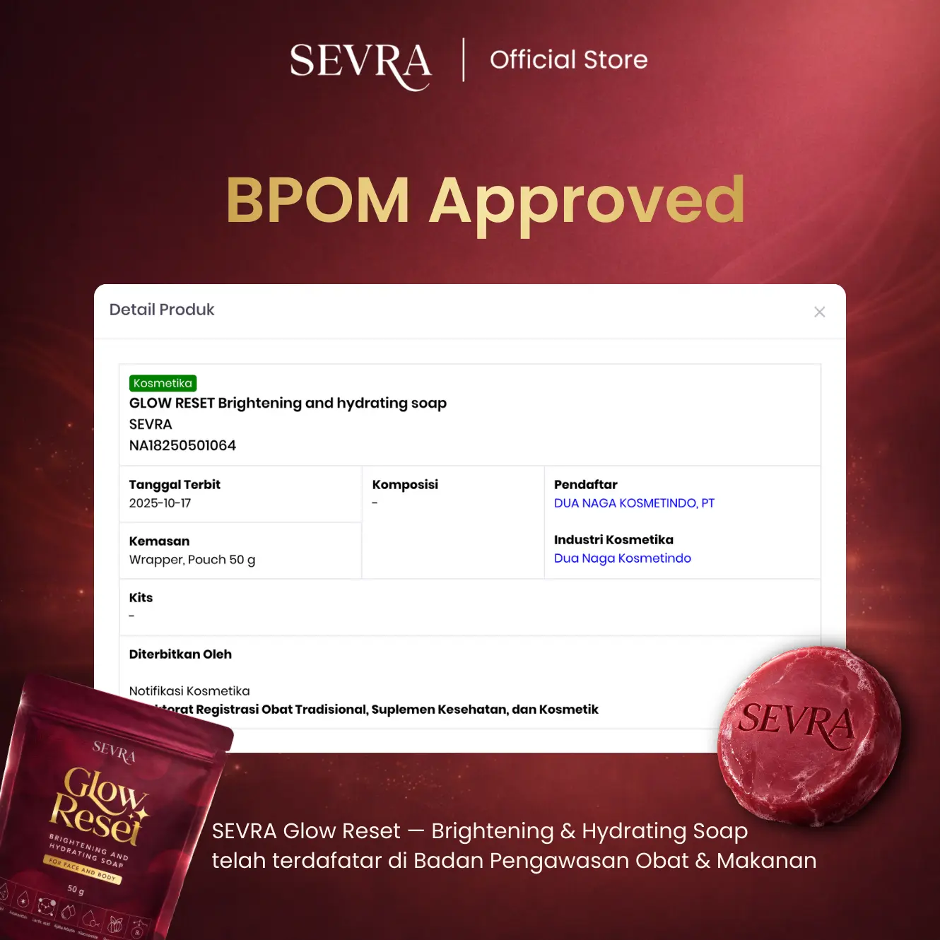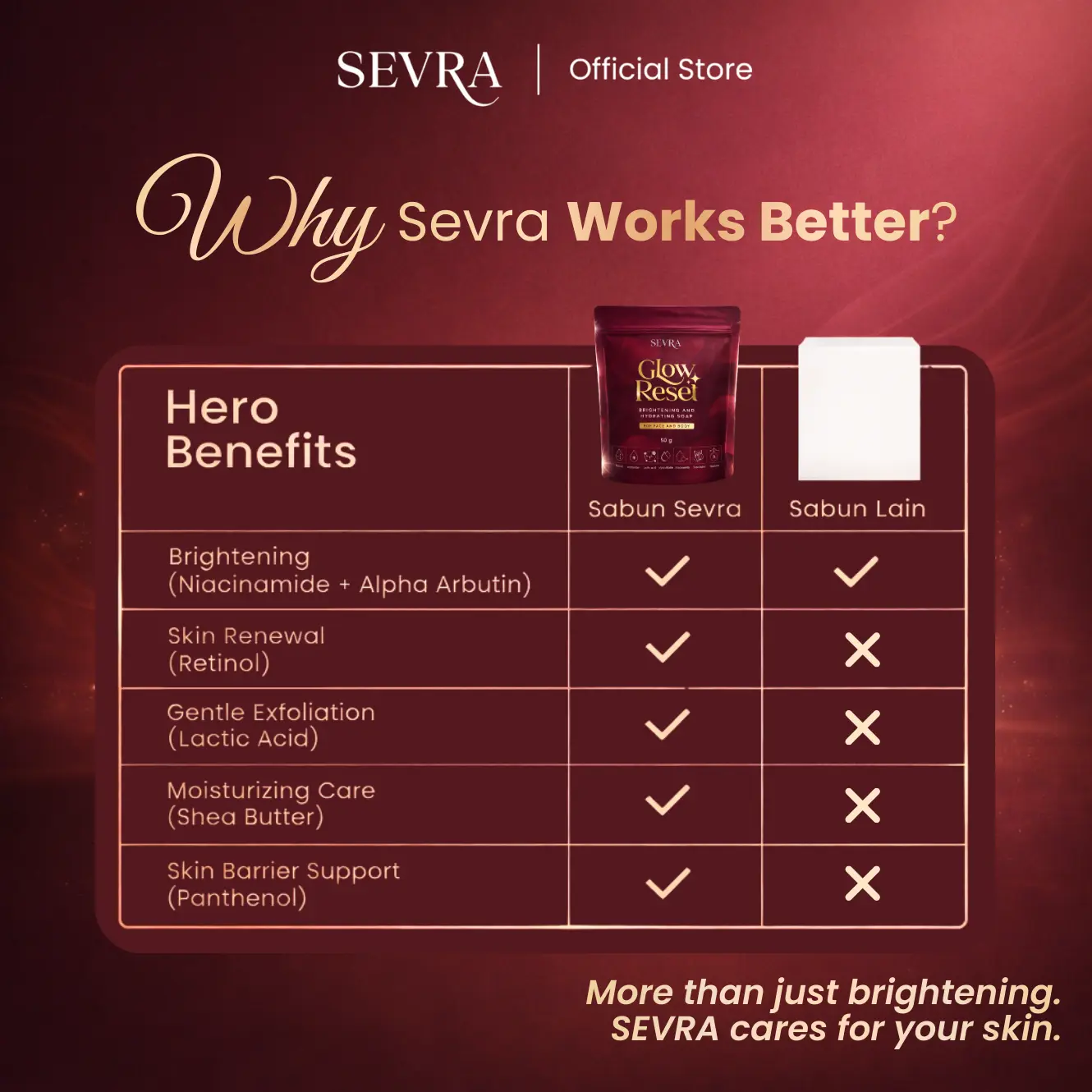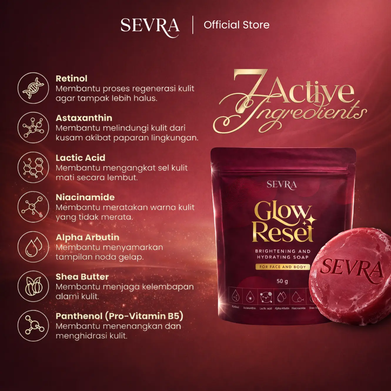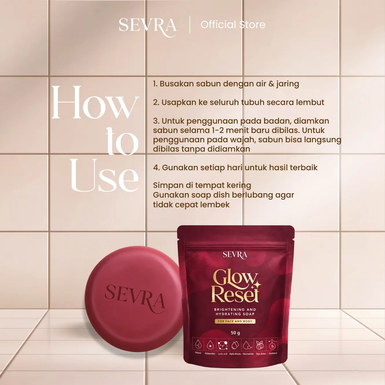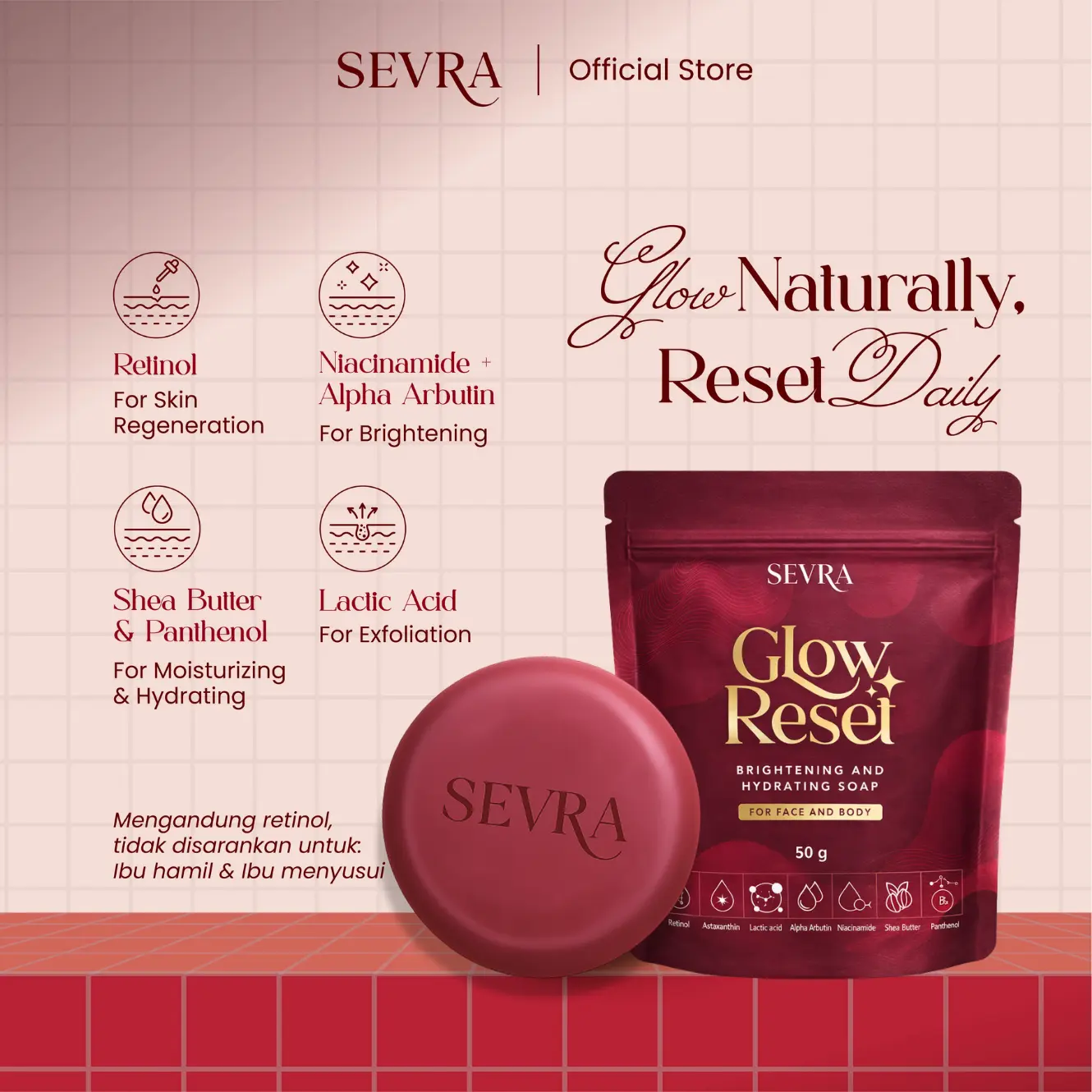 SEVRA Glow Reset adalah sabun eksfoliasi harian dengan formula skincare-grade yang membantu merawat kulit agar tampak lebih cerah alami, halus, dan tetap lembap dengan pemakaian rutin setiap hari. SEVRA dirancang agar setiap bahan saling mendukung dan bekerja seimbang sehingga hasilnya lebih nyata terlihat namun tetap nyaman di kulit. Kini SEVRA hadir dengan kemasan Ziplock agar mudah di bawa kemana-mana.
