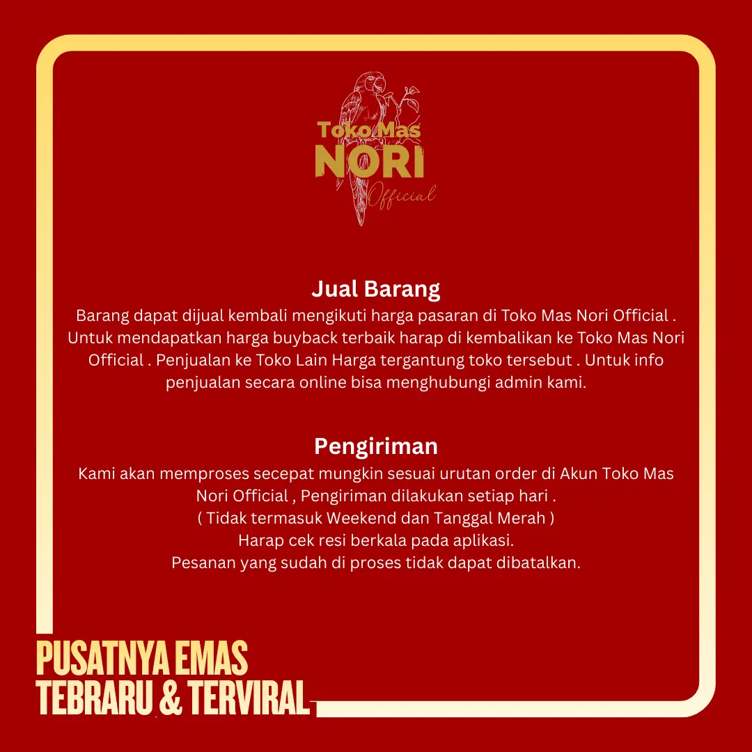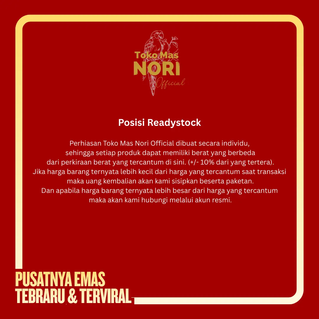 * Perhiasan Toko Mas Nori Official dibuat secara individu, sehingga setiap produk dapat memiliki berat yang berbeda dari perkiraan berat yang tercantum di sini. (+/- 10% dari yang tertera). Jika harga barang ternyata lebih kecil dari harga yang tercantum saat transaksi maka uang kembalian akan kami sisipkan di dalam paket. Dan apabila harga barang ternyata lebih besar dari harga yang tercantum maka, Admin kami akan menghubungi pembeli melalui akun admin resmi untuk pemberitahuan sisa kekurangannya untuk melanjutkan proses transaksi.