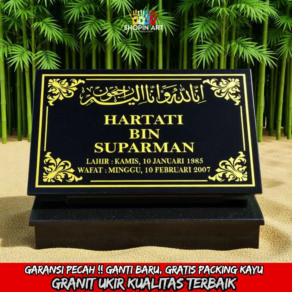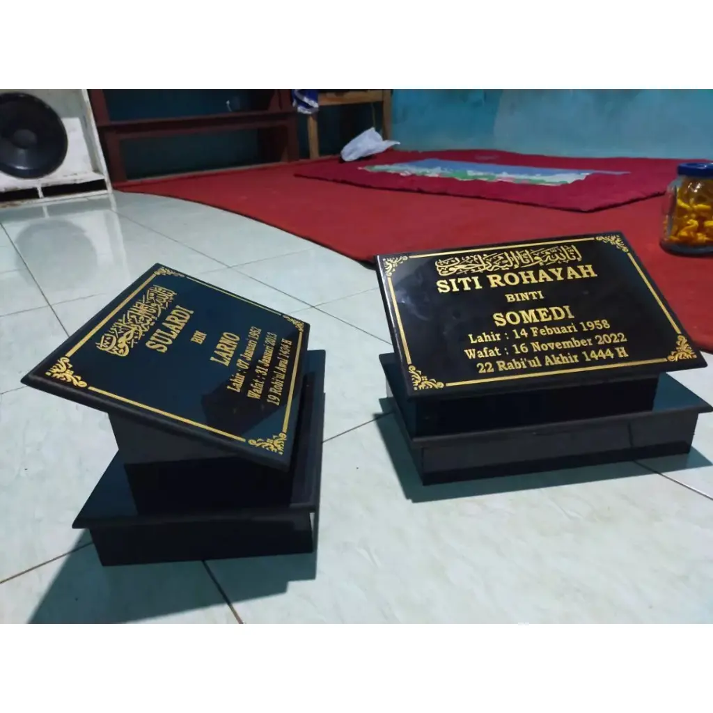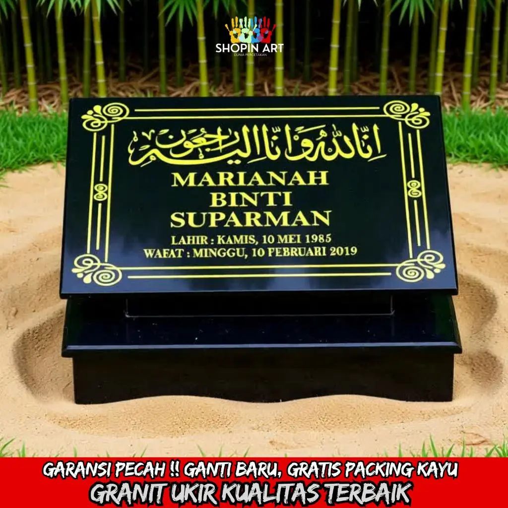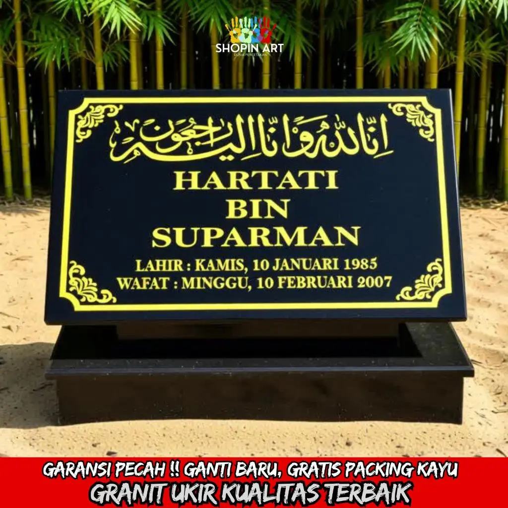 Batu nisan granit asli, custom ukir nama sesuai permintaan. Desain elegan, tahan cuaca, cocok untuk pemakaman Islam & umum. Terima pengiriman seluruh Indonesia.