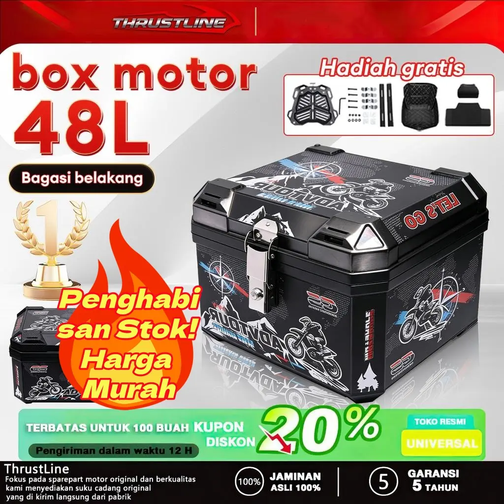 5. 【100% barang asli 】48 L Kapasitas Besar Tahan air Box Belakang Motor Kotak penyimpanan MOTOR MURAH ABS belakang sepeda motor untuk Gunung sepeda motor dengan lampu strip reflektif suku cadang bagasi bak truk Tail Top Box Almunium Alloy Case Motorcycle