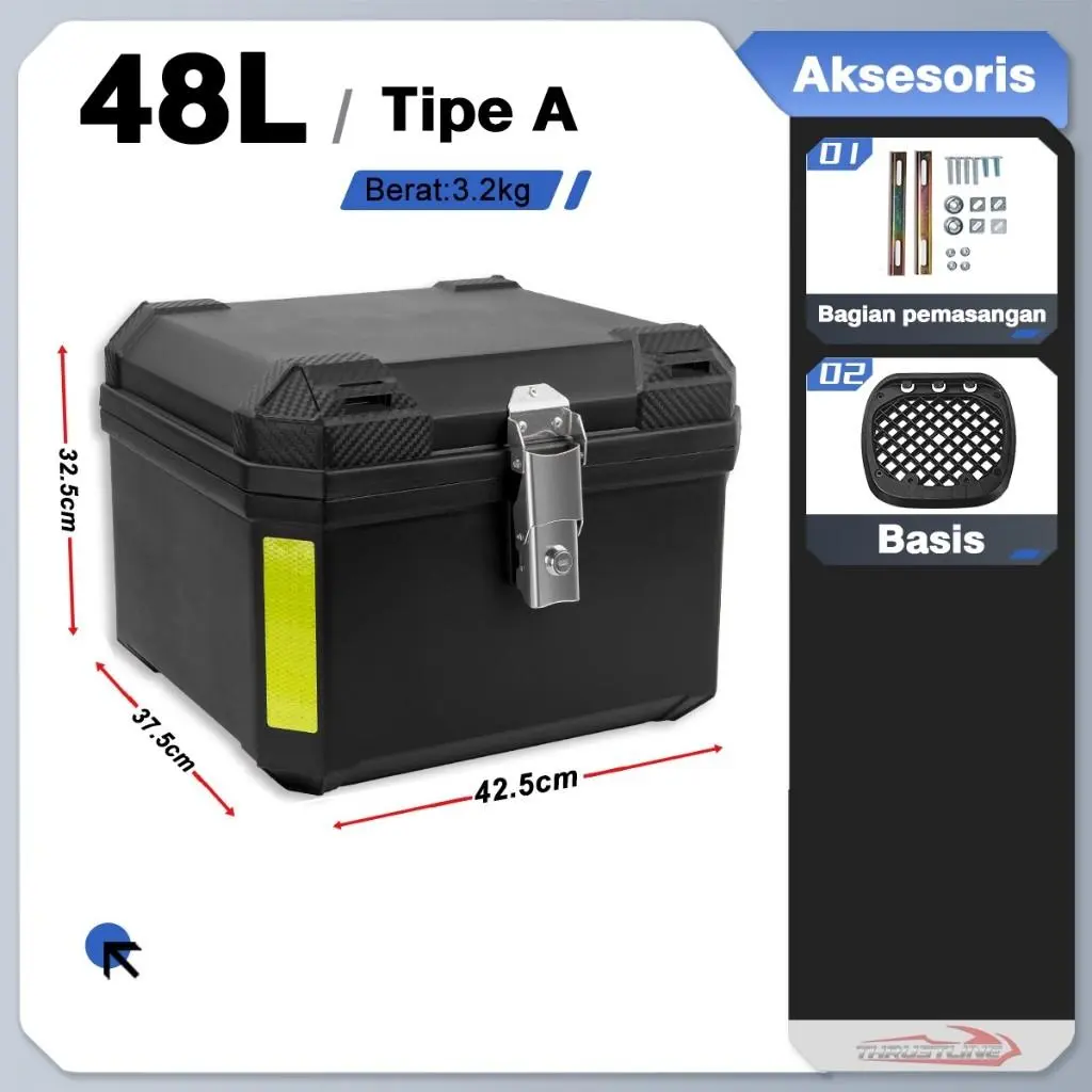 【100% barang asli 】48 L Kapasitas Besar Tahan air Box Belakang Motor Kotak penyimpanan MOTOR MURAH ABS belakang sepeda motor untuk Gunung sepeda motor dengan lampu strip reflektif suku cadang bagasi bak truk Tail Top Box Almunium Alloy Case Motorcycle
