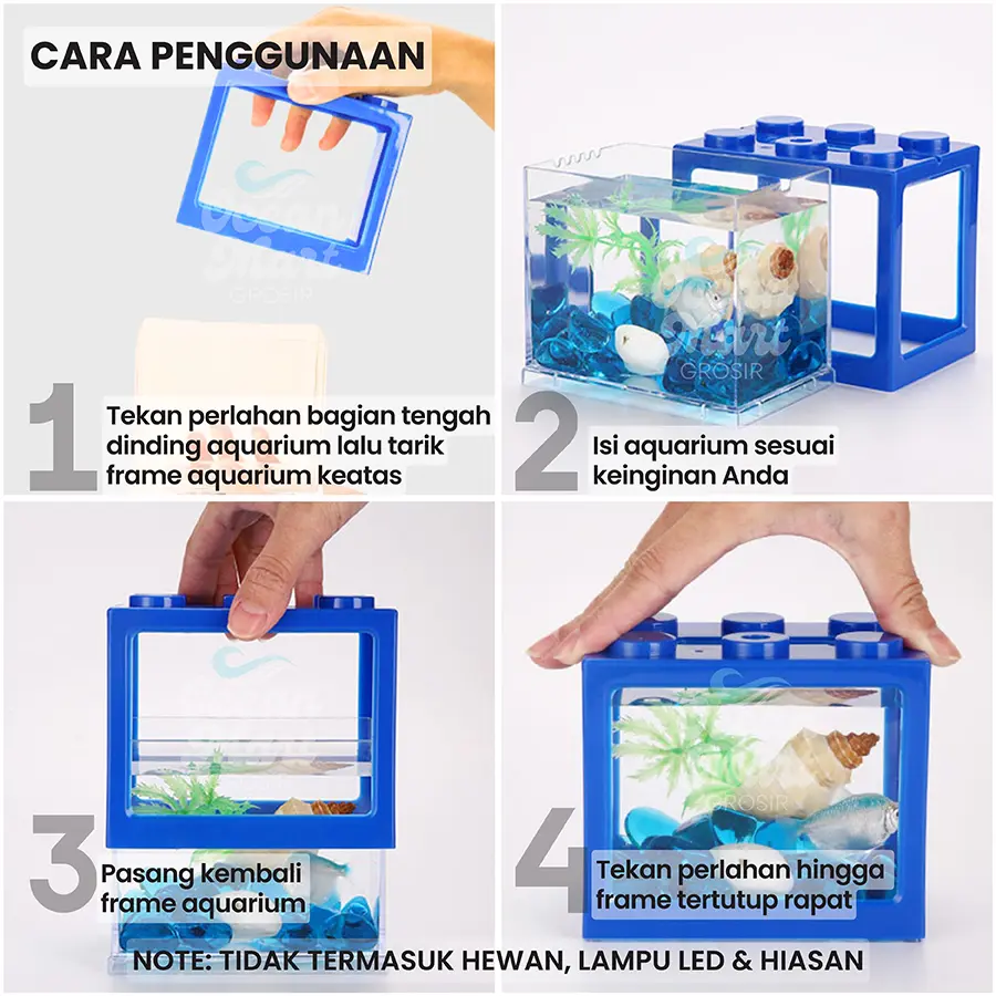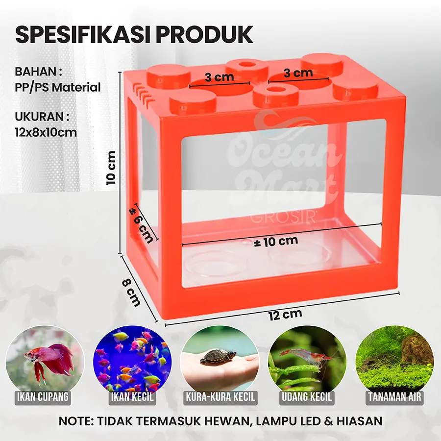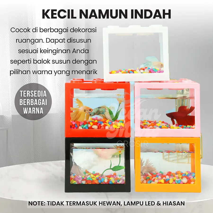 Akuarium Mini cocok untuk peliharaan ikan kecil atau hewan kecil hias lainnya seperti ikan cupang, laba-laba, Kura-Kura dan Reptil lainnya. Bisa disusun meninggi max 3 tingkat dengan berbagai macam variant warna lainnya selain menjadi aquarium tempat ini juga bisa sebagai penghias kamar dengan model yang unik dan lucu.