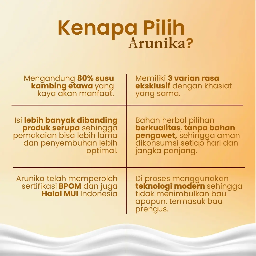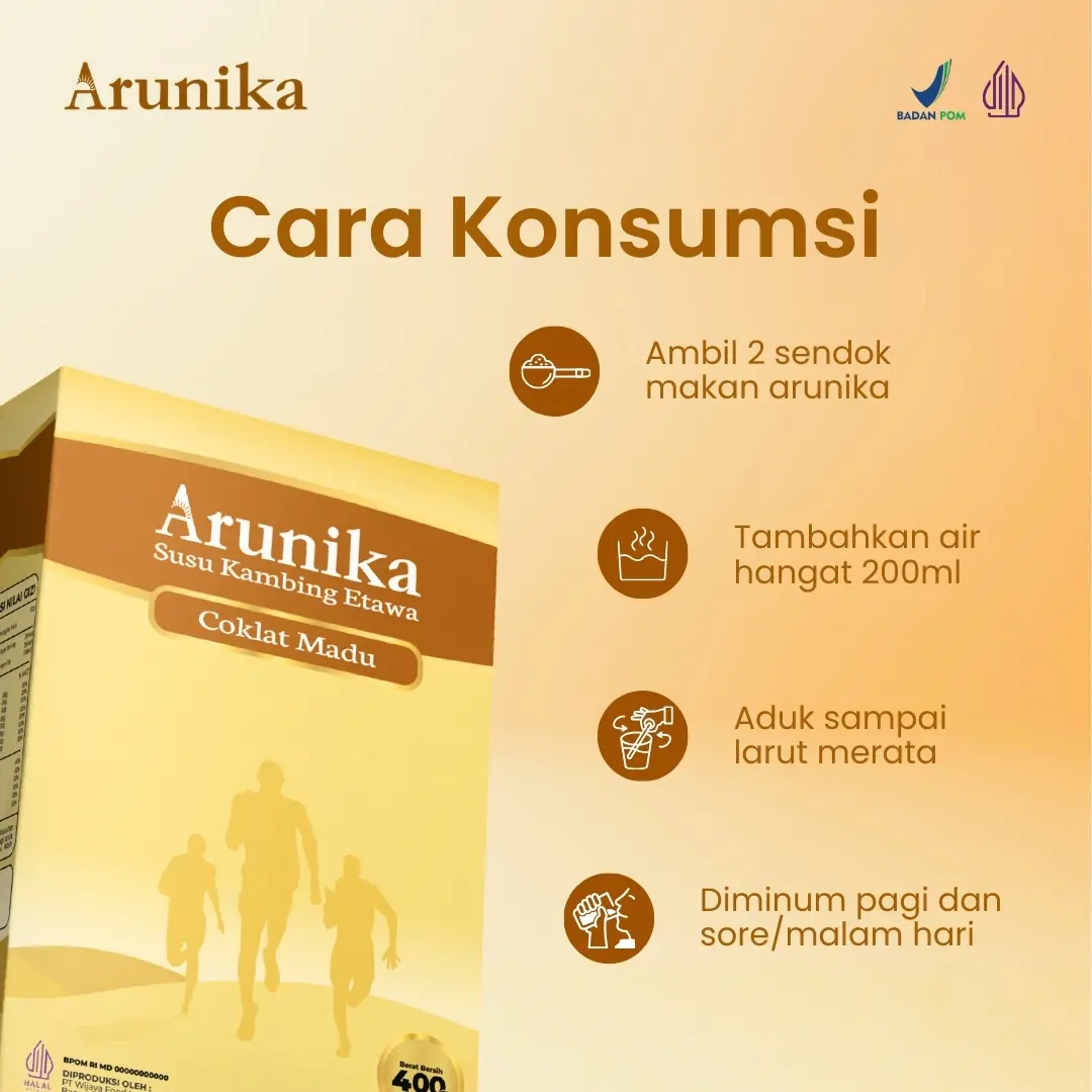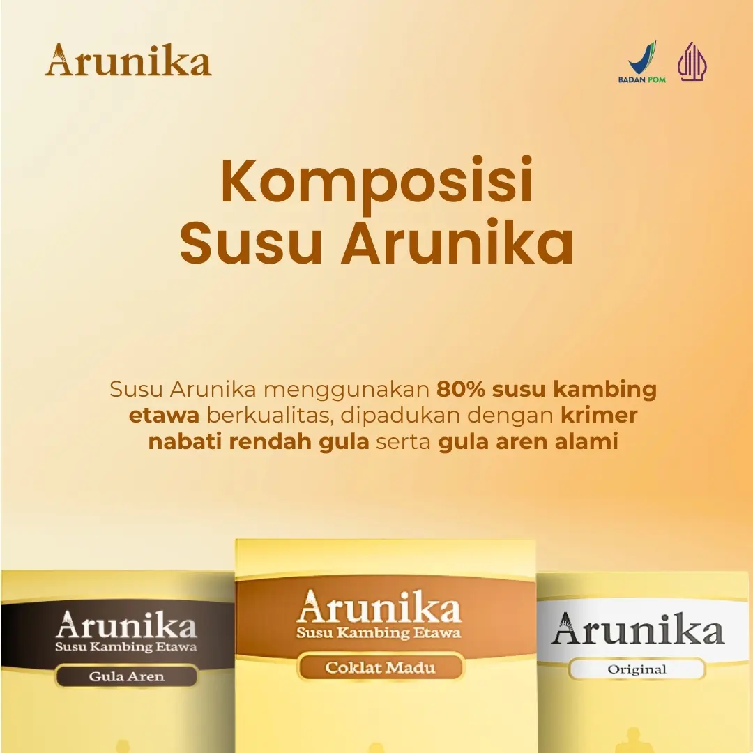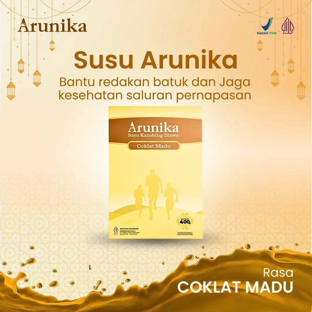 Arunika Susu Kambing Etawa adalah minuman kesehatan keluarga yang diformulasikan khusus untuk membantu menjaga fungsi pernapasan. Menggunakan 80% Susu Kambing Etawa Berkualitas, Tinggi Kalsium & Antioksidan, Nyaman di Lambung, Prebiotik Alami dipadukan dengan krimer nabati rendah gula serta gula aren alami, Arunika menghadirkan rasa lembut tanpa bau prengus berkat proses pengolahan modern.