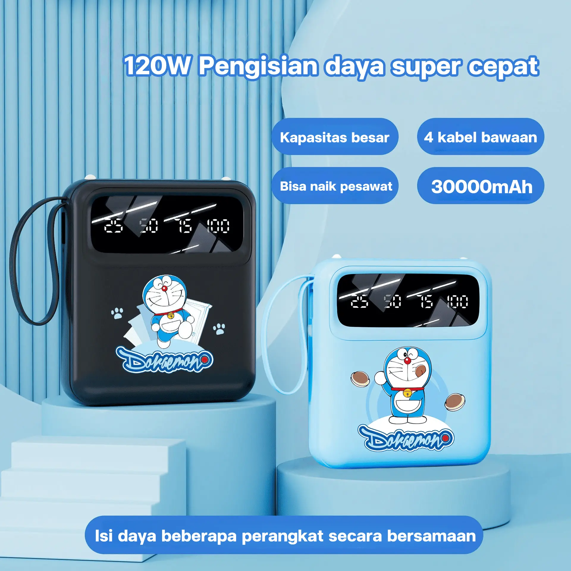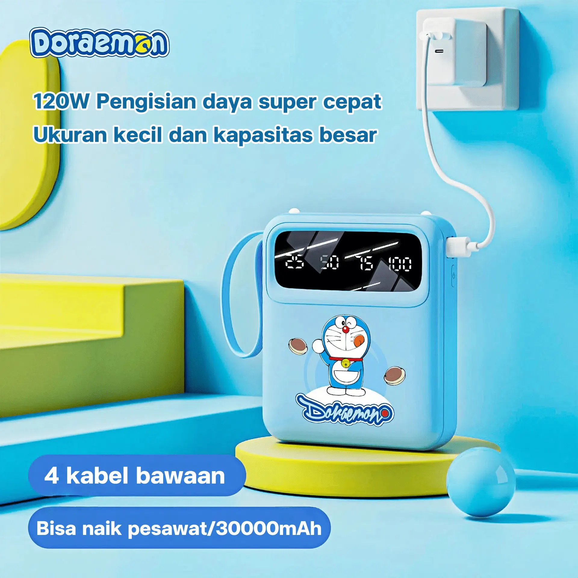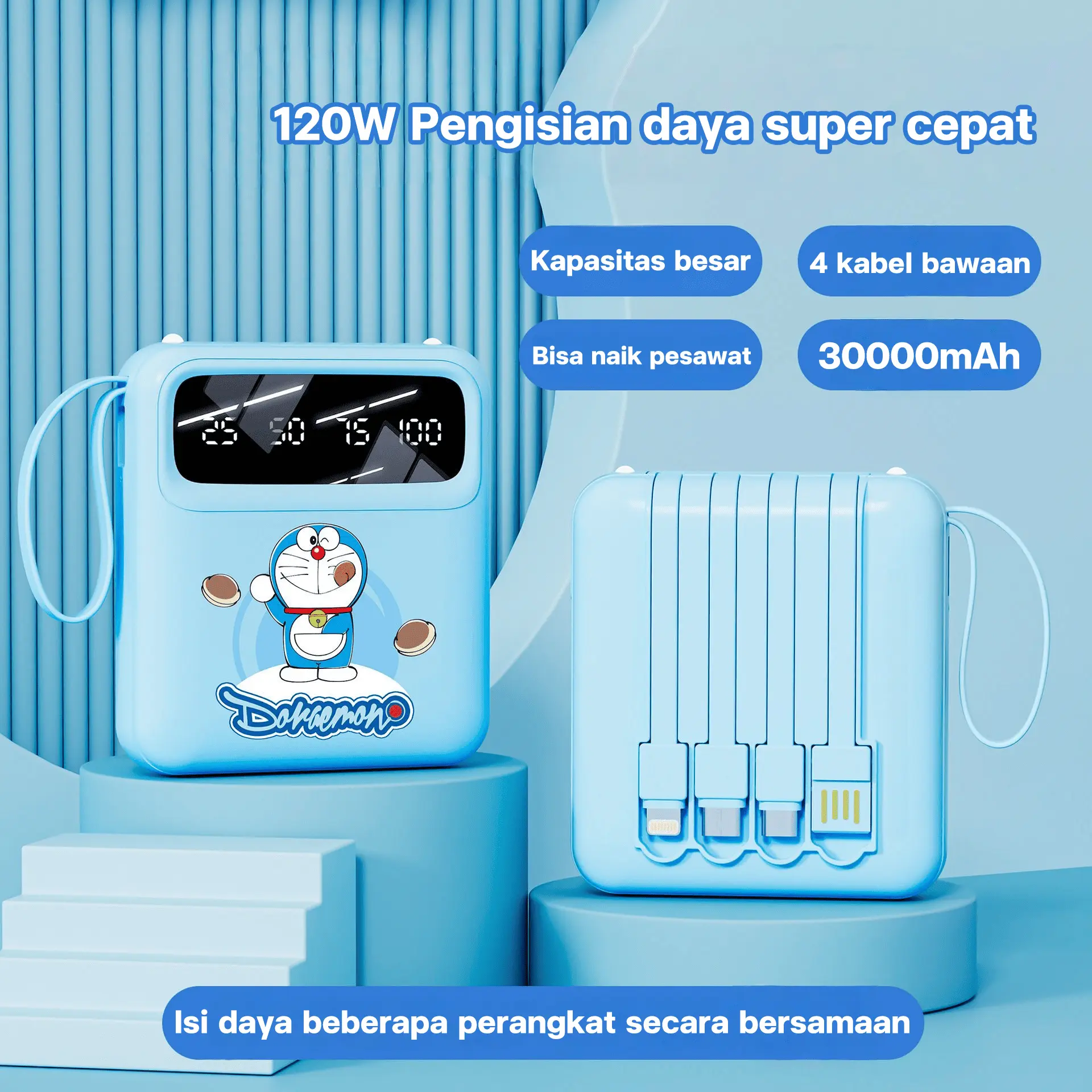 Doraemon 120W Powerbank Ponsel 30000mAh motif Kartun 4 Kabel Bawaan Kapasitas Besar Ultra Tipis & Portabilitas Kompak