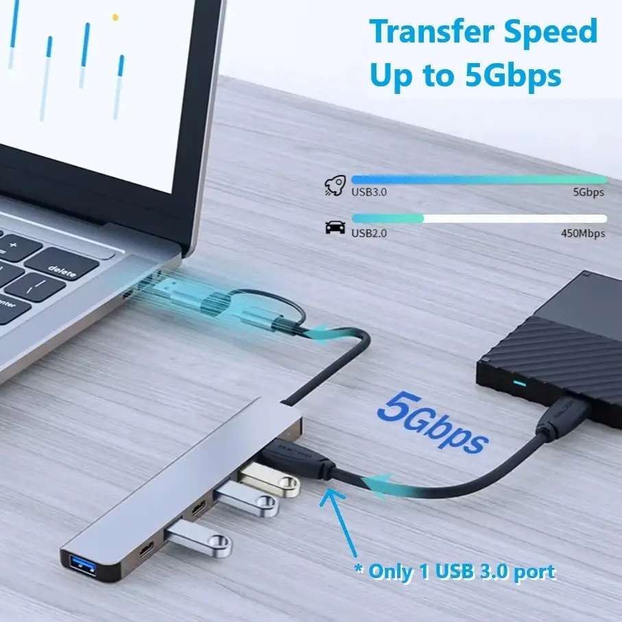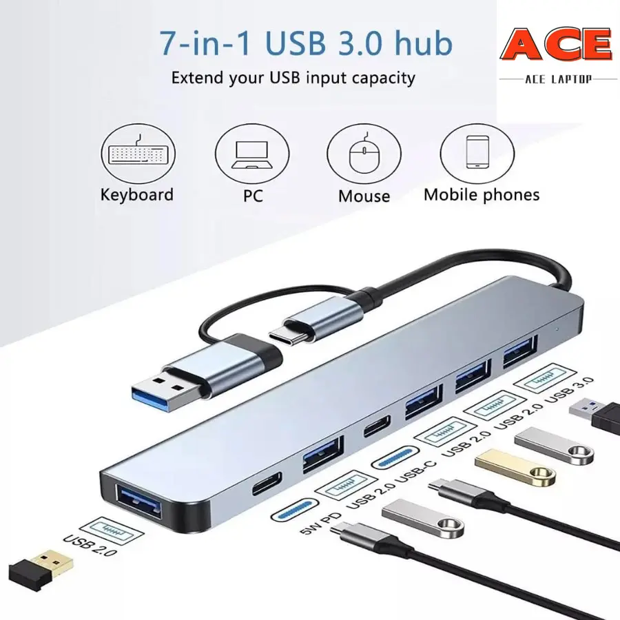 7-in-1 USB Hub Type C High Speed USB 3.0 Extender Adapter USB-C 2.0 PC Laptop Phones Tablets