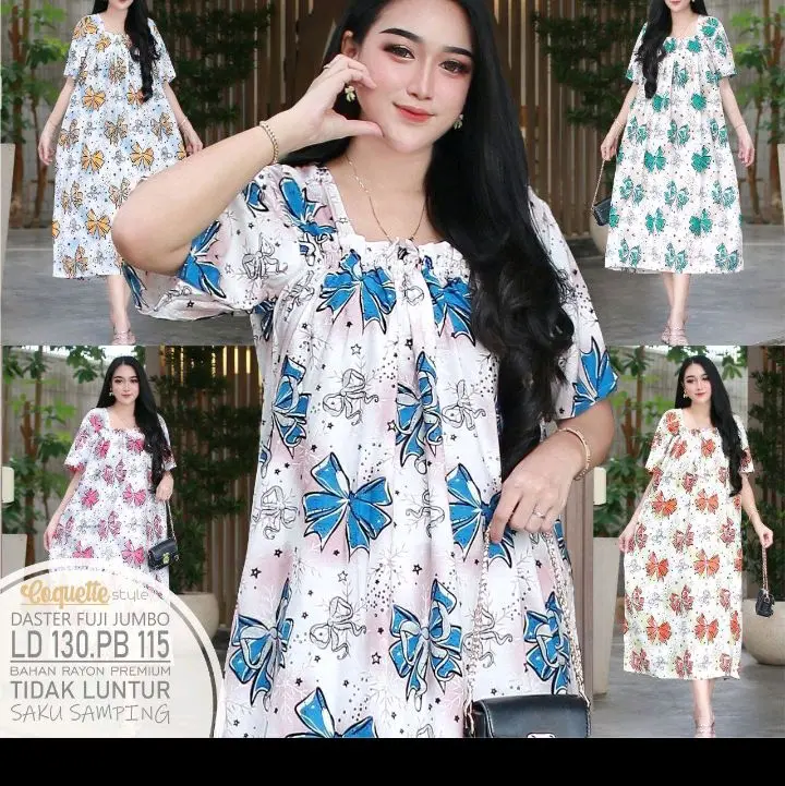 Daster Fuji Coquette Jumbo LD 130 PB 115 adalah pilihan yang tepat untuk Anda yang mencari daster dengan bahan rayon premium dan saku samping. Tidak luntur dan ukurannya yang jumbo membuatnya sangat nyaman dan praktis. Minimal BB sampai 80