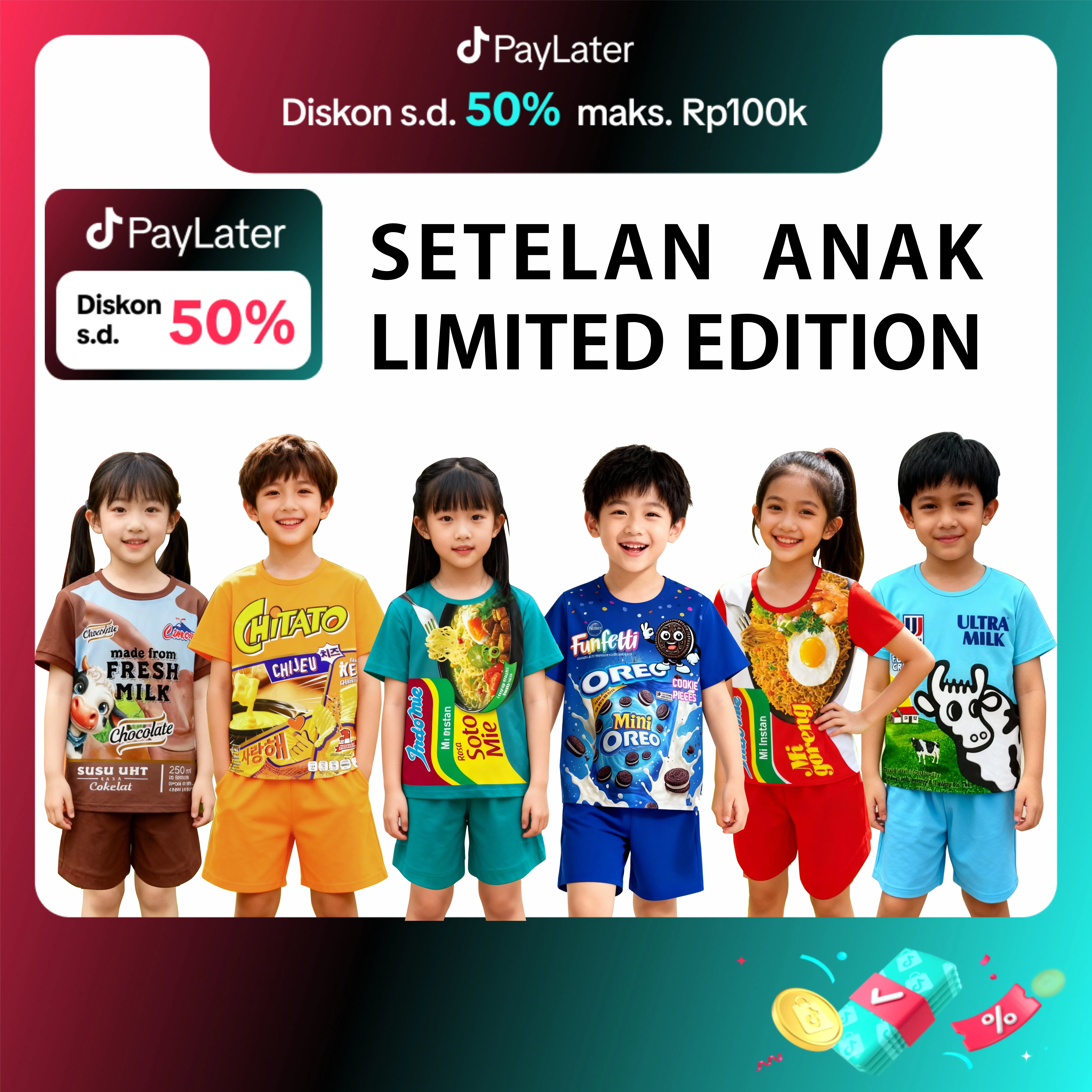 Setelan untuk anak laki-laki dan perempuan. Motif Indomi, Chitato, Ultramilk, Sotomie, cimory dan oreo. Cocok untuk anak yang suka motif-motif ini. Tidak ada perbedaan desain untuk kedua jenis anak. Pilihan tepat untuk anak usia 1-8 tahun. Dengan motif viral, setelan ini membuat anak tampil lucu dan nyaman.