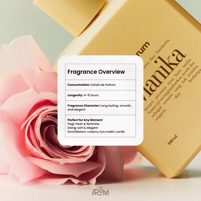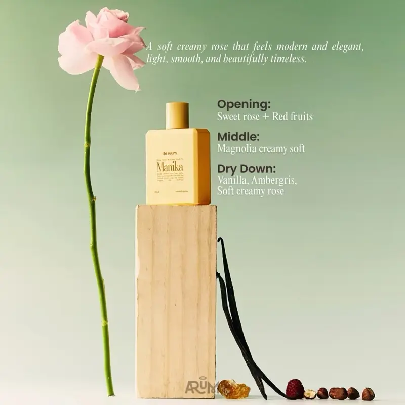 Manika berarti Batu Permata Berharga dalam bahasa Jawa. Manika adalah mawar yang elegan, bersih, dan mahal vibesnya. Bukan rose yang tua atau menyengat ini rose yang feminin, classy, dan dewasa, warm. Wangi ini cocok buat kamu yang suka aroma mahal tapi ngga berisik.