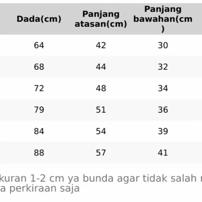 âąS: Lingkar dada 64cm, panjang baju 42cm (1-2thn), panjang celana 30cm (Bb 9-12kg)
