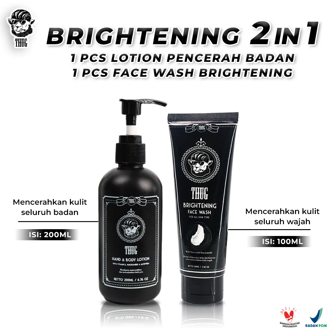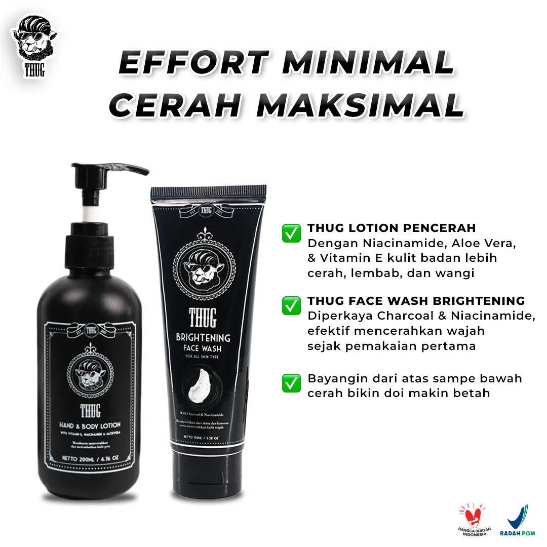 Gausah pusing bro, langsung pake Thug Brightening 2in1 Lotion Pencerah + Face Wash Brightening paling pas bikin kulit lo lebih cerah, lembut, wangi & ga ribet!