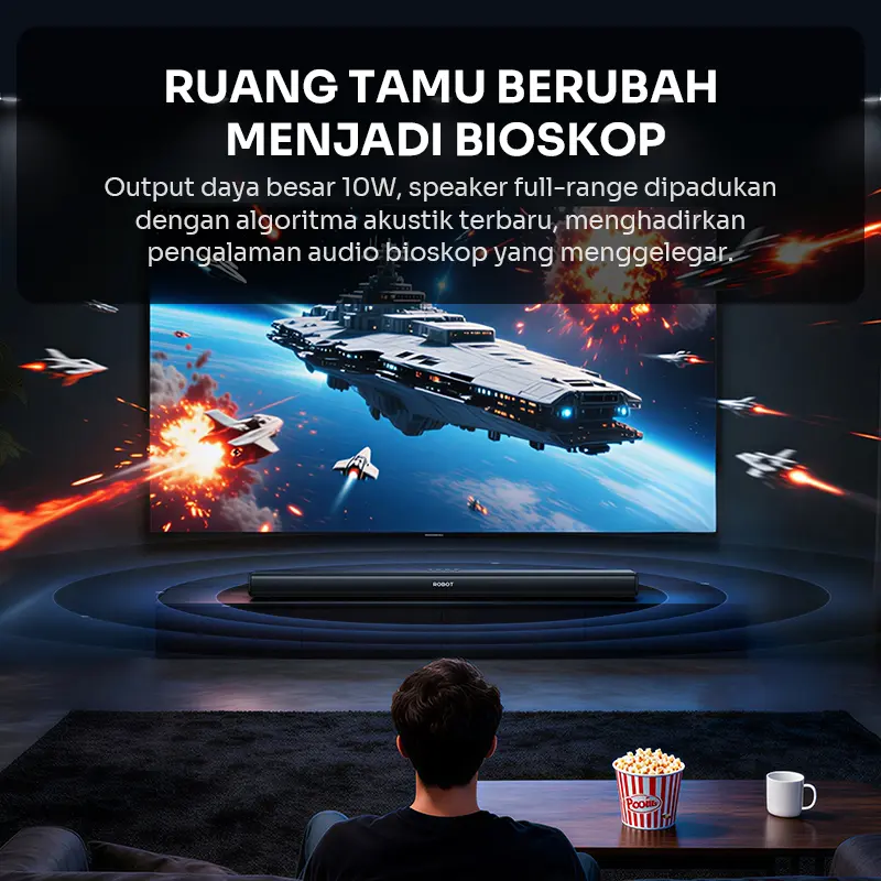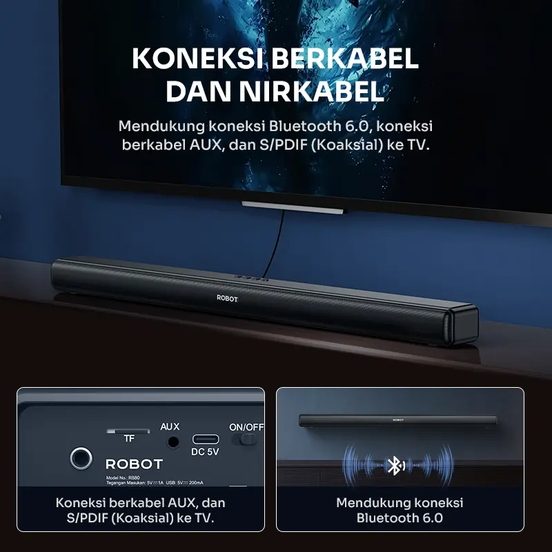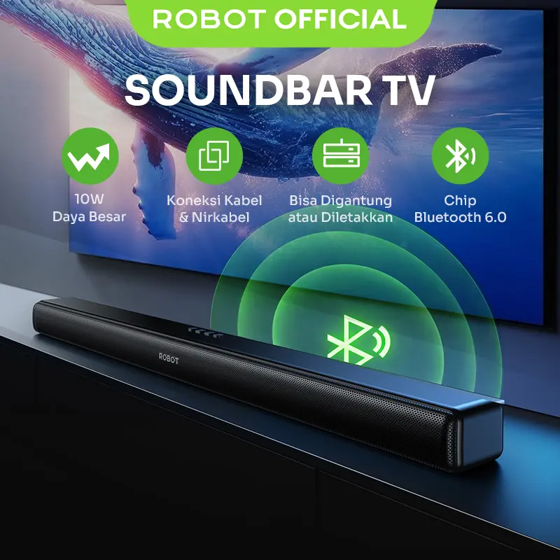 Nikmati pengalaman audio bioskop di rumah dengan ROBOT RB80 Soundbar TV! ROBOT RB80 adalah solusi audio premium untuk meningkatkan kualitas suara TV, laptop, dan smartphone. Dengan teknologi Bluetooth 6.0 terbaru dan Dual Bass Enhancer, speaker ini menghasilkan suara jernih dengan bass mendalam.