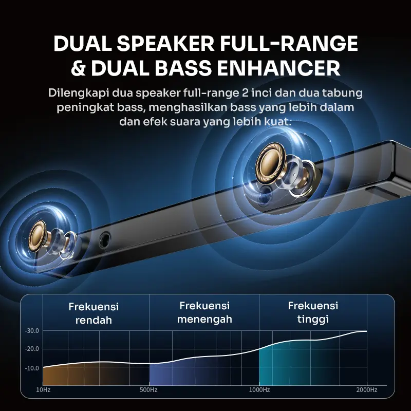 ·Dua speaker 2 inci dan dua tabung peningkat bass.