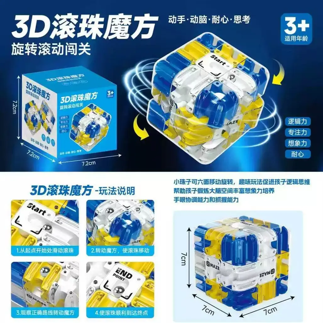 Mainan 3D Rolling Maze Cube adalah mainan puzzle edukatif berbentuk kubus dengan jalur bola di dalamnya. Anak dapat memutar kubus secara perlahan untuk mengarahkan bola dari titik awal hingga titik akhir melalui jalur yang tersedia.