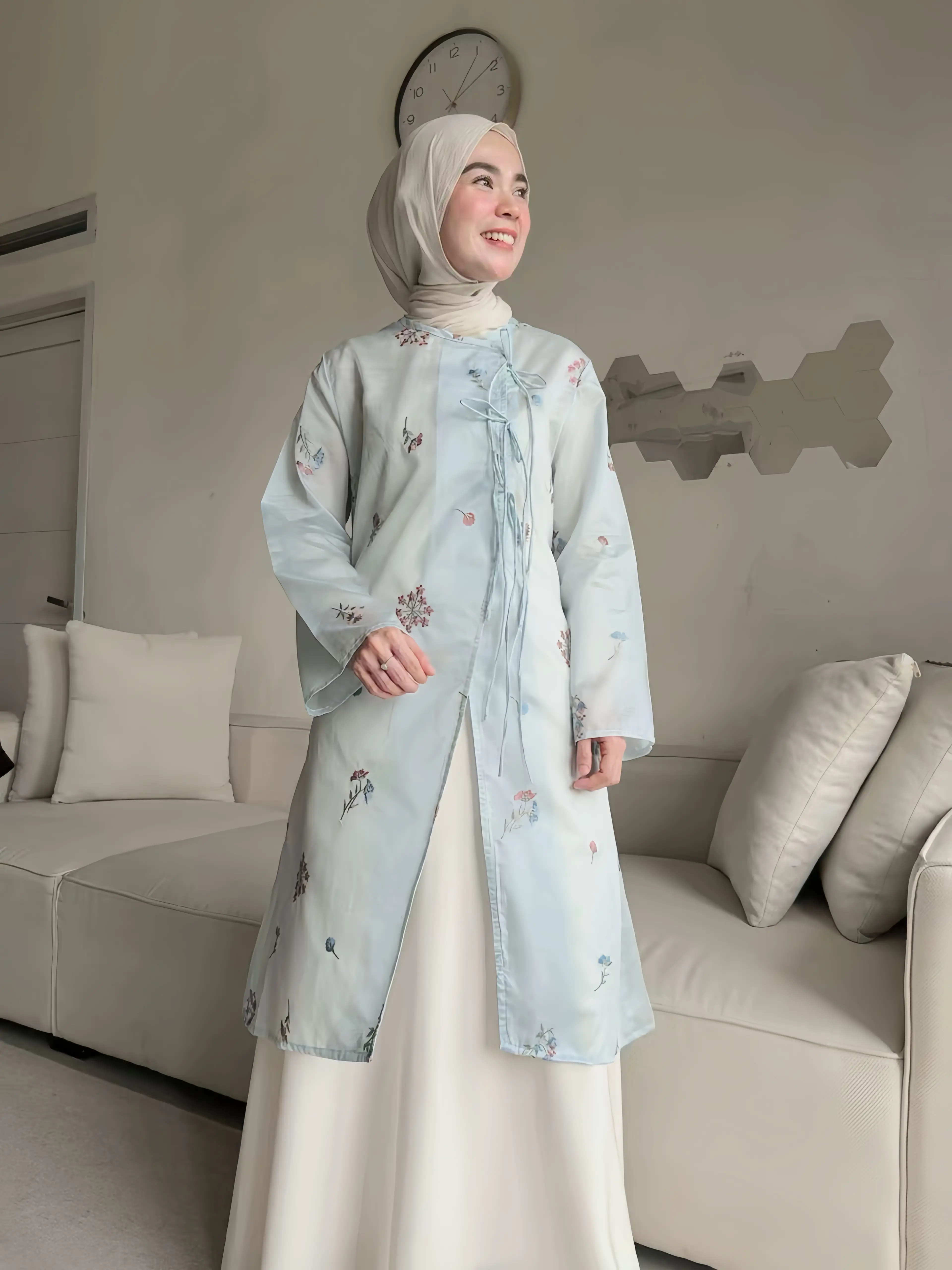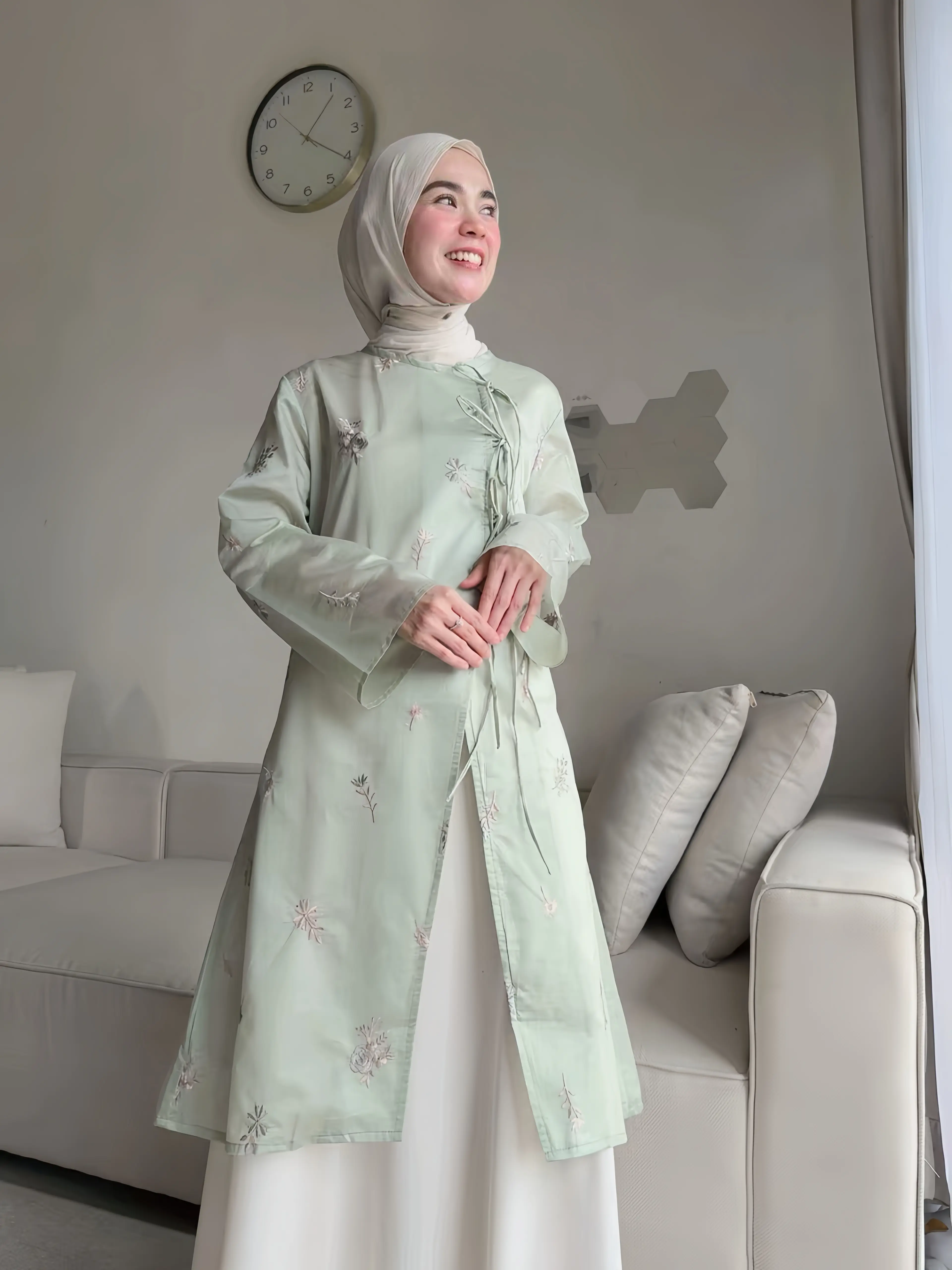 Panjang 100 cm, potongan asimetris dengan detail tali aktif di bagian depan, kerah bulat, bordir full depan-belakang.