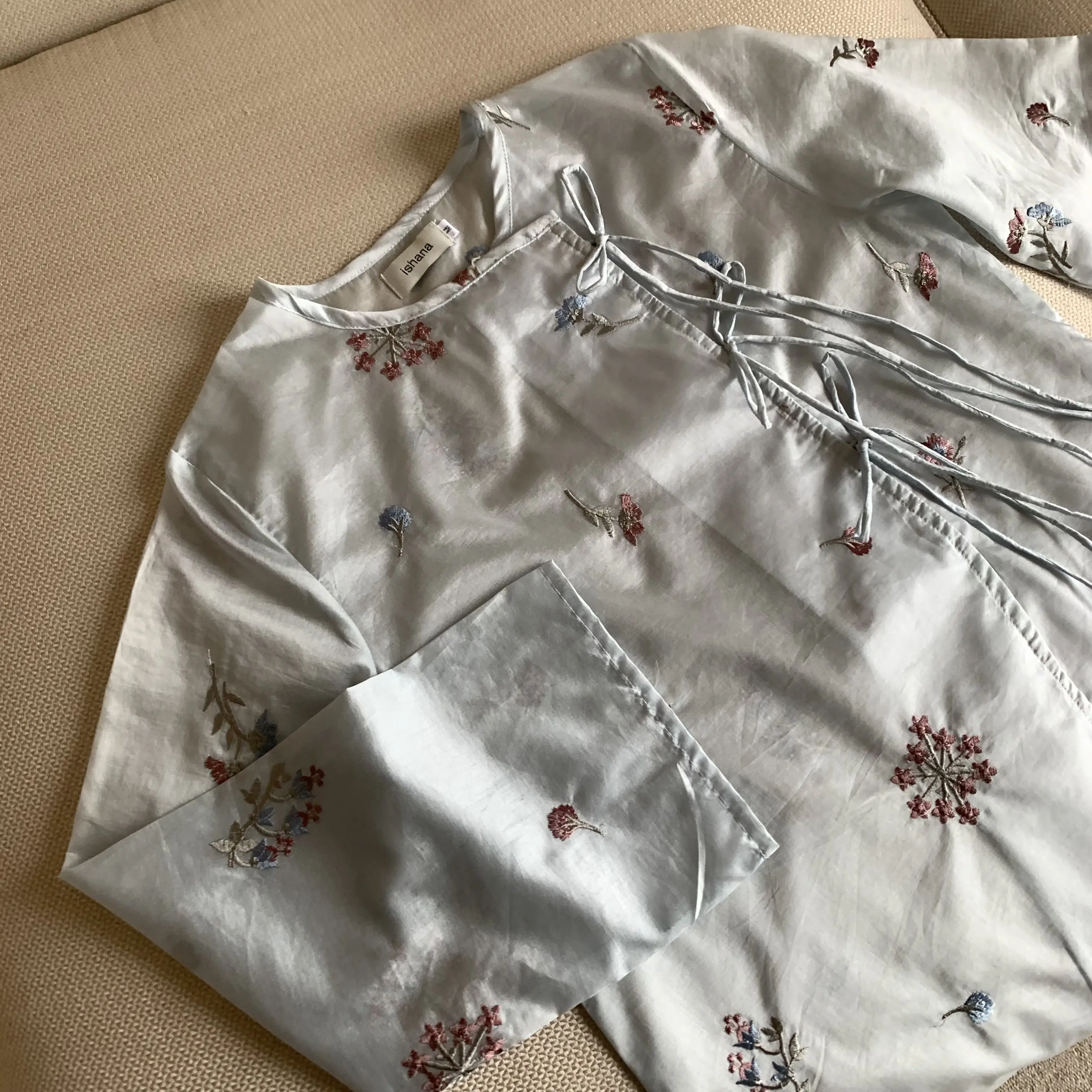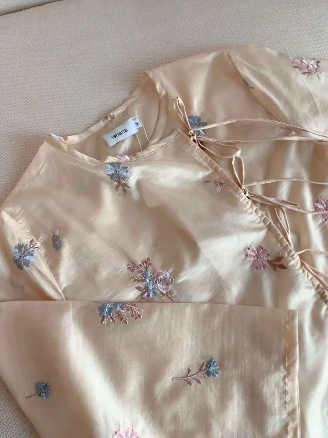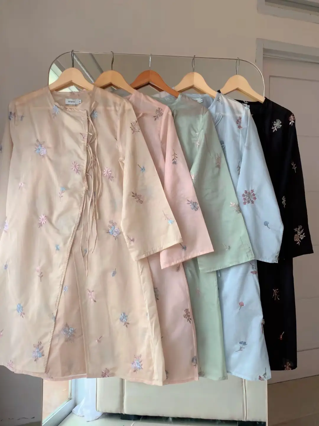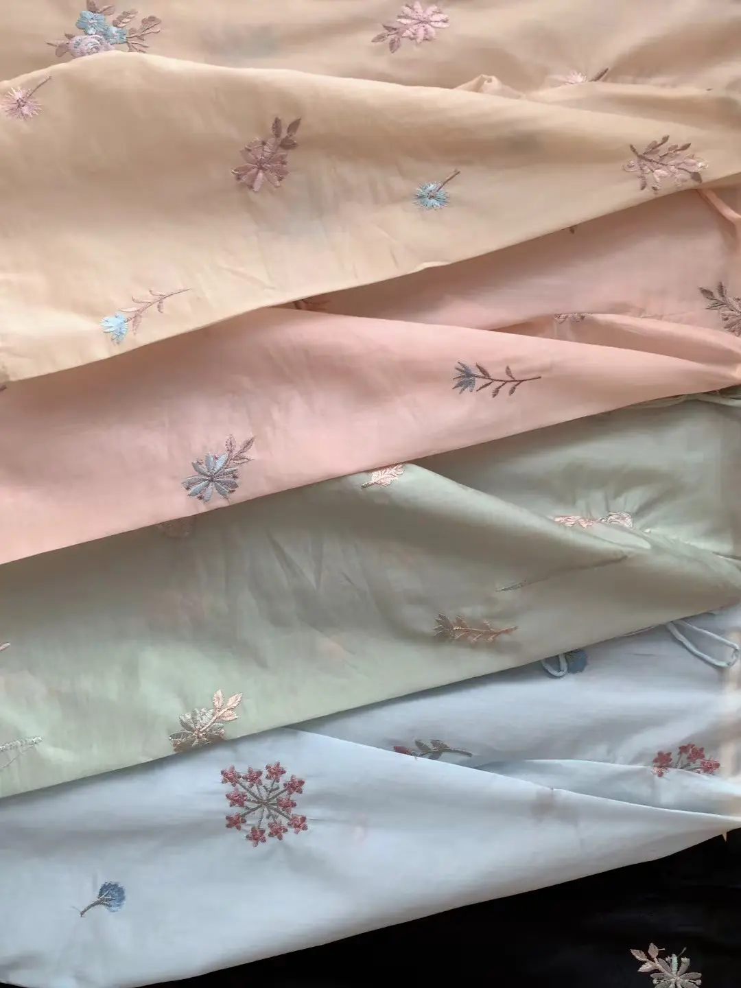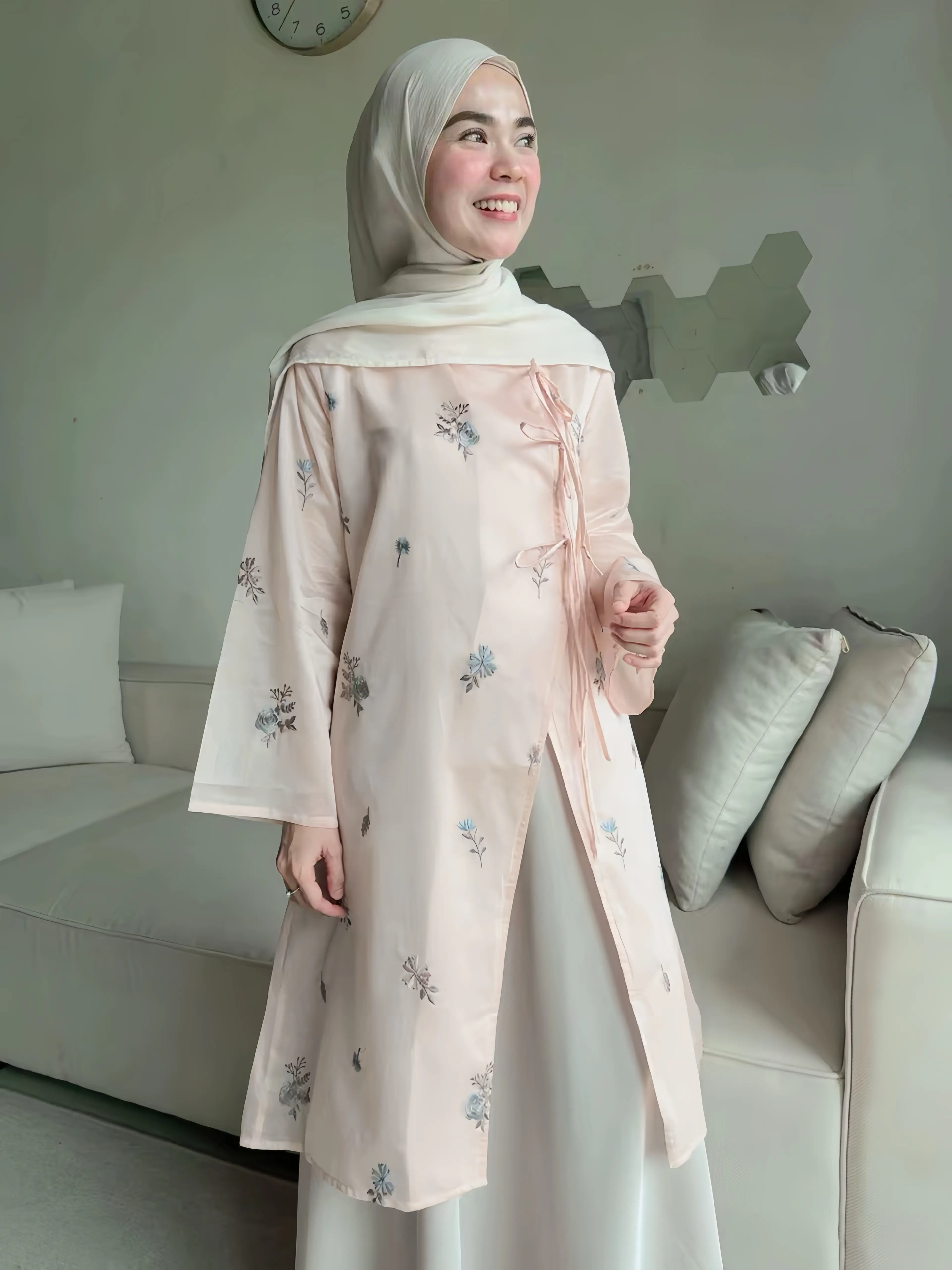 Kainnya sheer (sedikit menerawang) dengan efek shiny lembut khas serat alami, memberi tampilan lebih mewah dibanding kain polos. Dihiasi bordir bunga yang cantik dan anggun di seluruh permukaan kain.