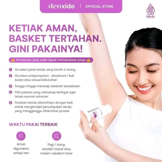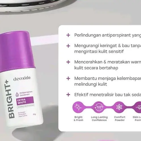 Pastikan Anda menggunakan Deoxide Antiperspirant Deodorant Roll On BRIGHT+ untuk kulit yang lebih cerah dan segar.