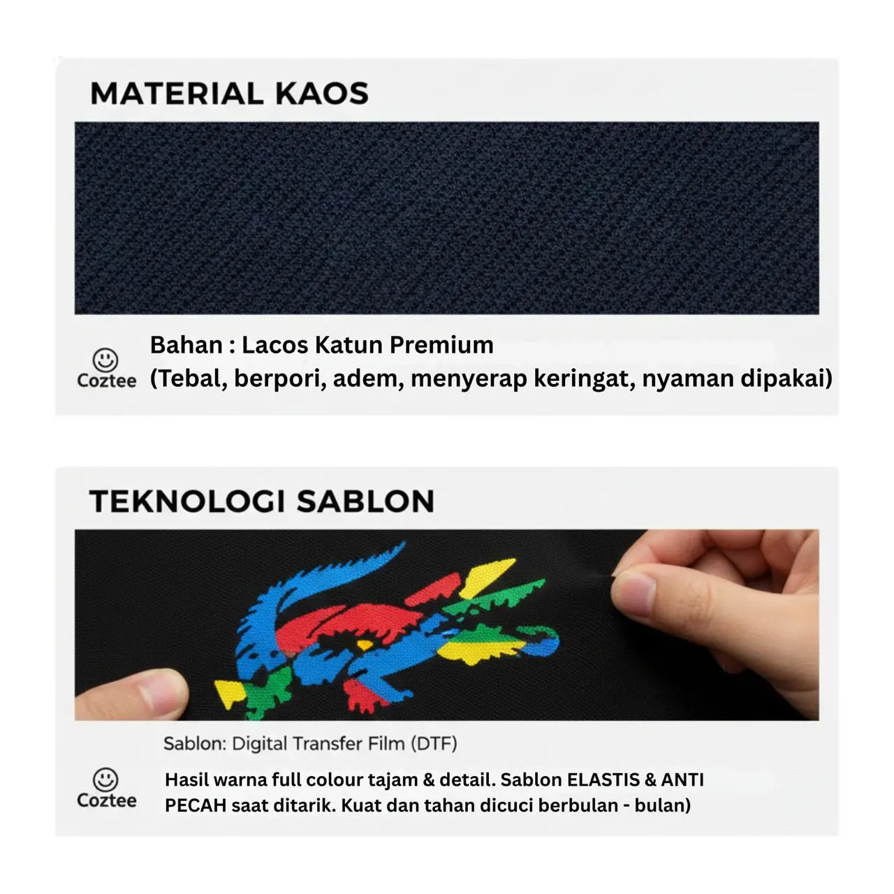 * Sablon: Digital Transfer Film (DTF). Hasil warna tajam, detail, dan full color.