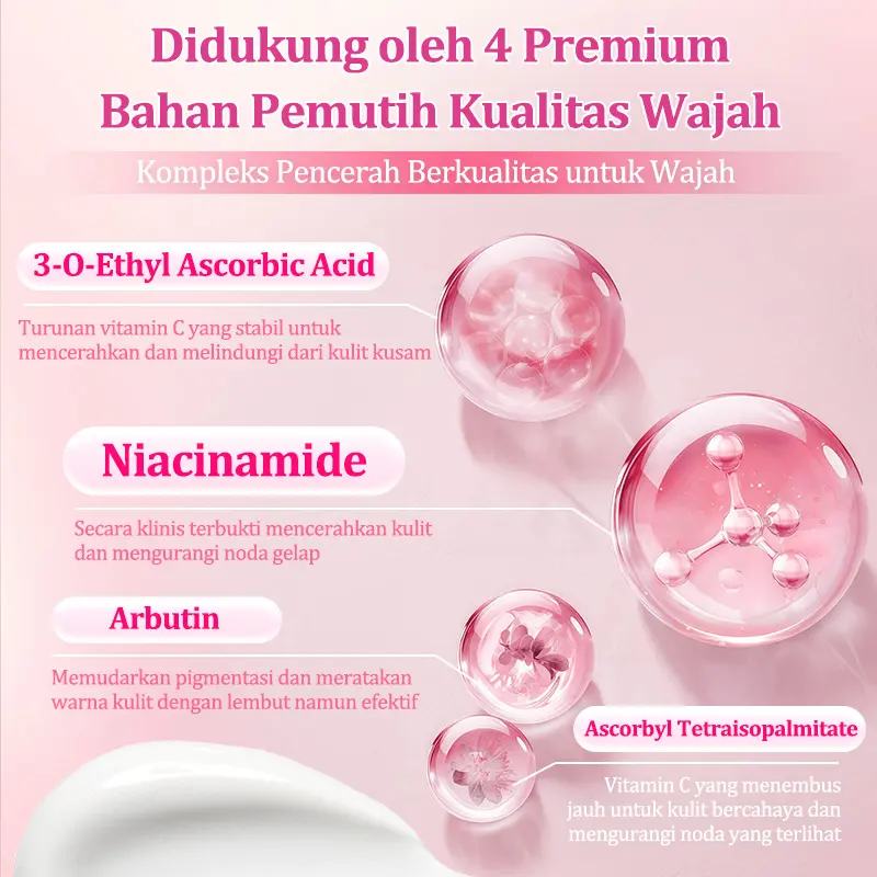 Bahan: Niacinamide, 3-O-Ethyl Ascorbic Acid, Arbutin, Ascorbyl Tetraisopalmitate, dll.