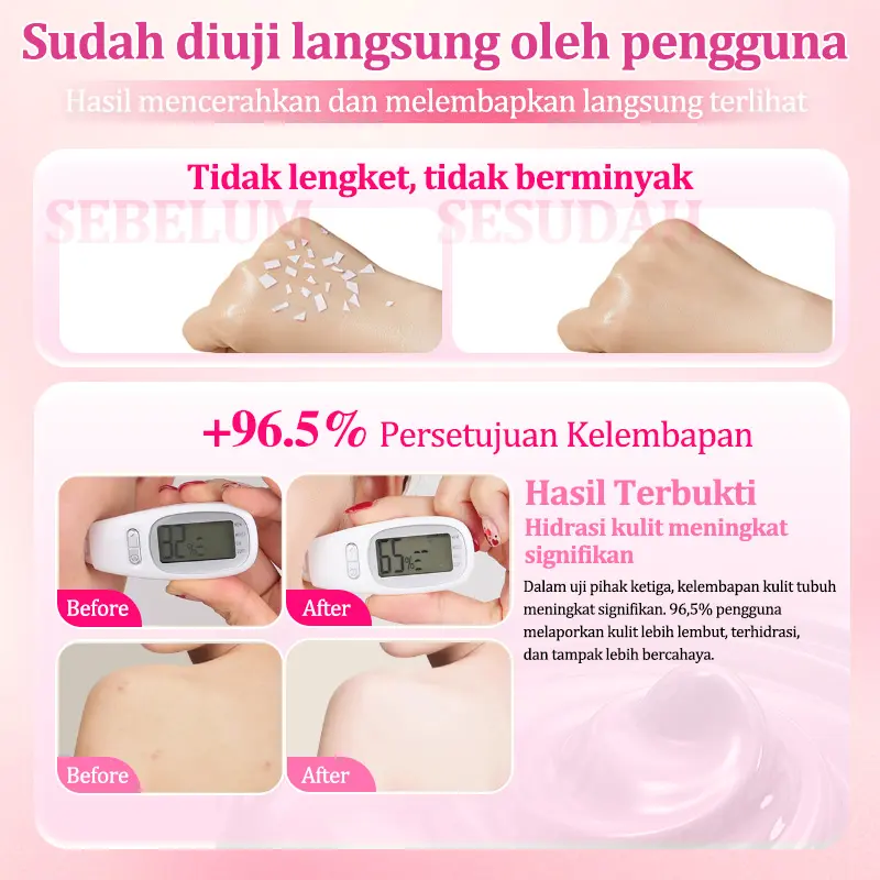 Sebelum dan setelah penggunaan, kulit terlihat lebih cerah dan lembap. Net: 150 g.