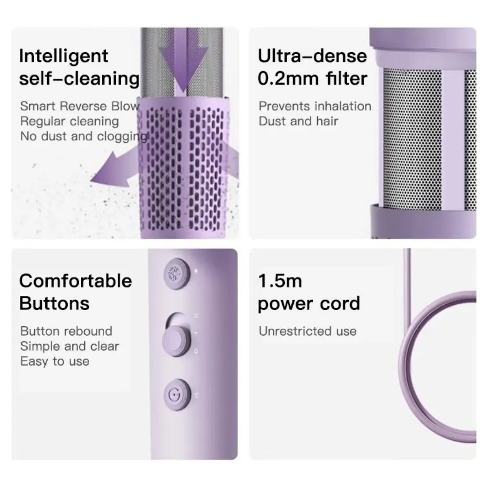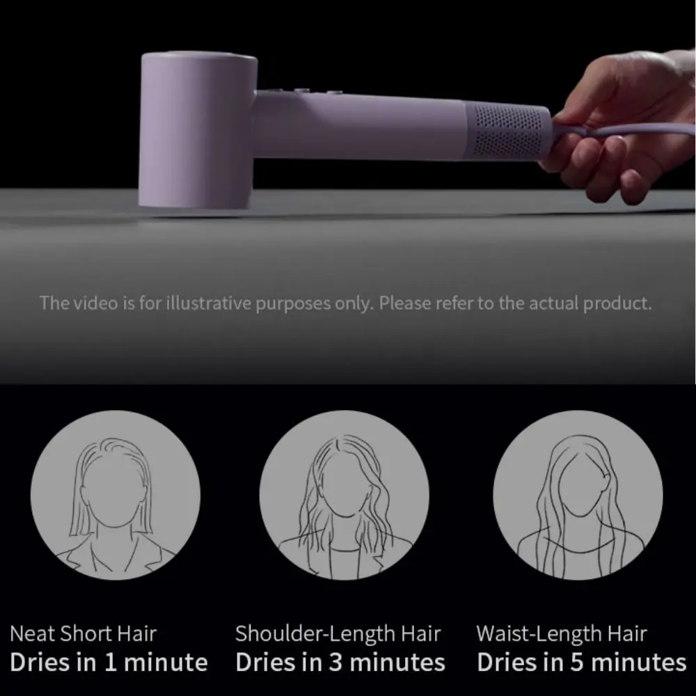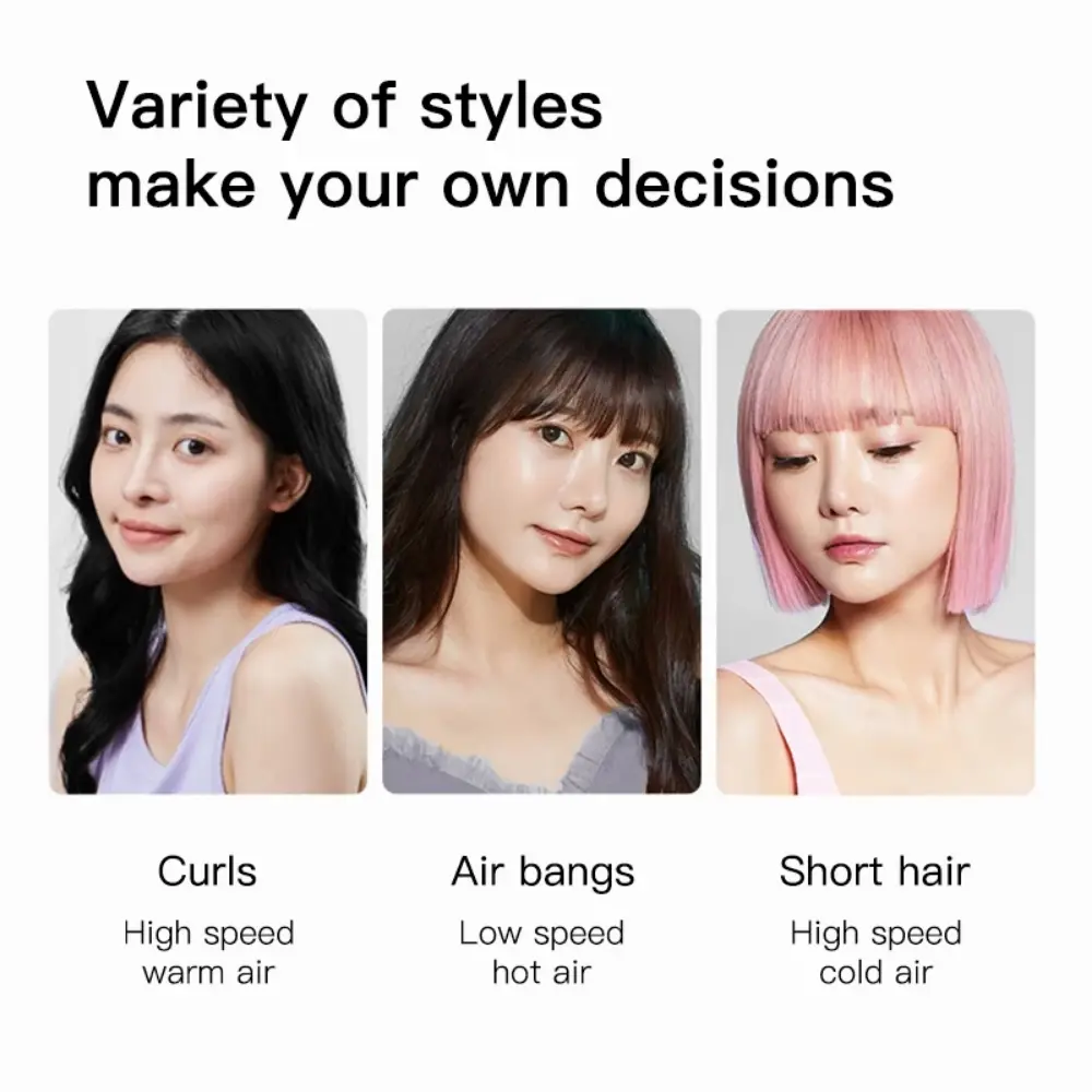 Fast drying, perfect styling. Mengeringkan rambut lebih cepat daripada hair dryer tradisional. Short hair ≈ 1 min, mid-length hair ≈ 3 min, long hair ≈ 5 min. 6 opsi pengaturan suhu dan 3 mode pengaturan suhu.
