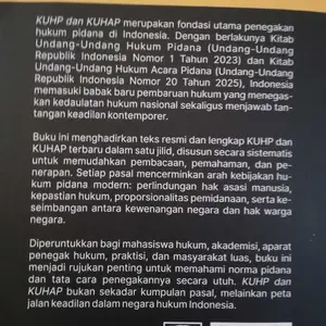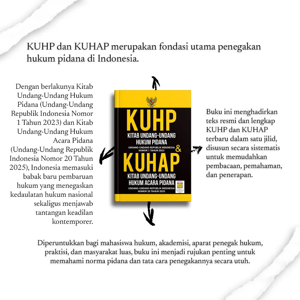 Diperuntukkan bagi mahasiswa hukum, akademisi, aparat penegak hukum, praktisi, dan masyarakat luas, buku ini menjadi rujukan penting untuk memahami norma pidana dan tata cara penegakannya secara utuh. KUHP dan KUHAP bukan sekadar kumpulan pasal, melainkan peta jalan keadilan dalam negara hukum Indonesia.
