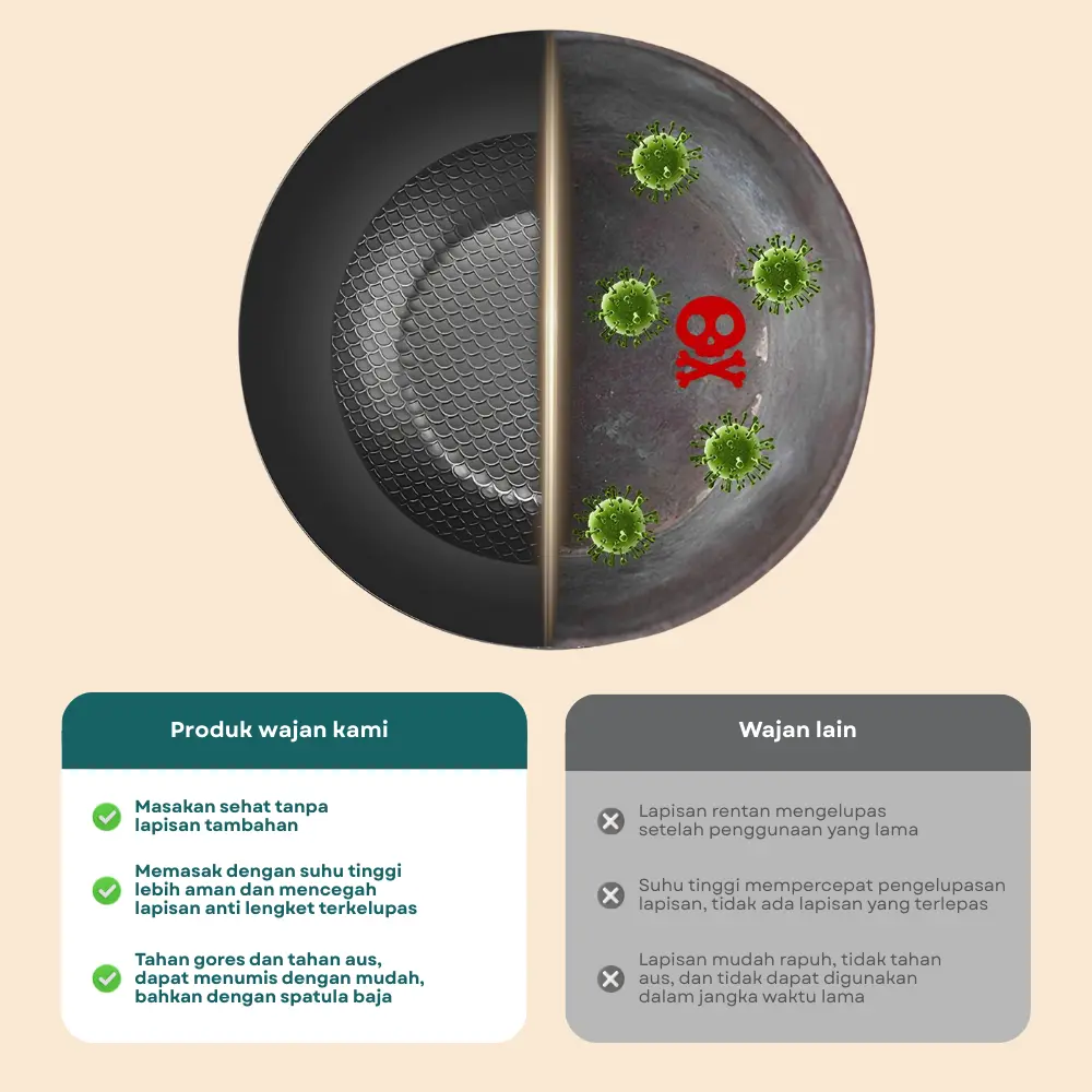 Desain gagang kayu ergonomis nyaman digenggam dan tidak panas saat digunakan. Cocok untuk kebutuhan masak harian, dapur keluarga, hingga kafe dan restoran.