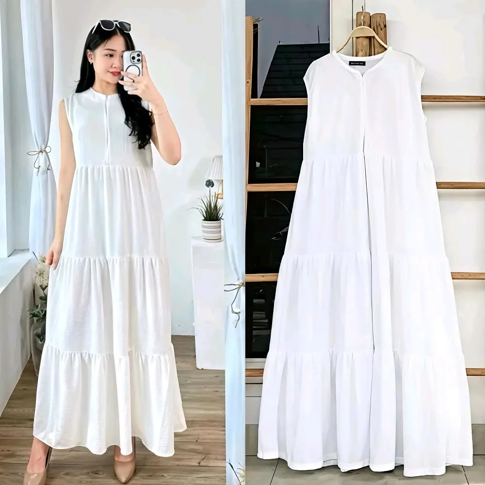 Baju wanita maxi putih tanpa lengan, desain elegan dan nyaman. Cocok untuk penggunaan sehari-hari dan ibu menyusui. Tampilan modern dan menarik. 🌟
