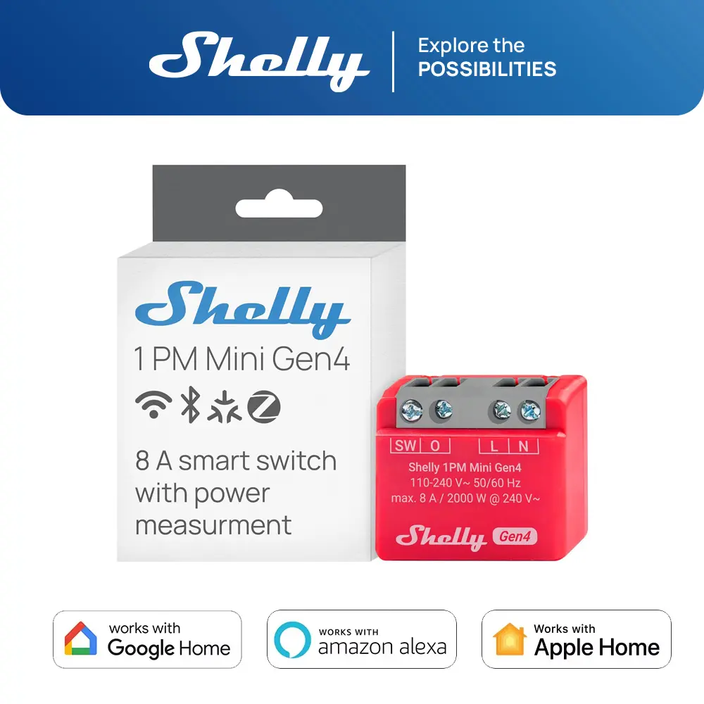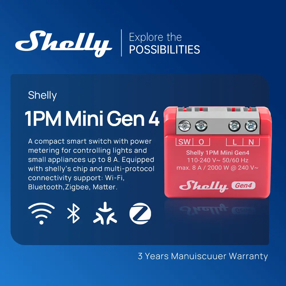·The Shelly 1PM Mini Gen4 is a Wi-Fi, Zigbee, and Matter-compatible smart switch with precise power monitoring - no hub required. Its upgraded processor and 8 MB memory ensure fast, efficient performance. Set up in under 10 minutes and control your appliances from anywhere. All the features of Shelly’s standard devices, now in a compact form.