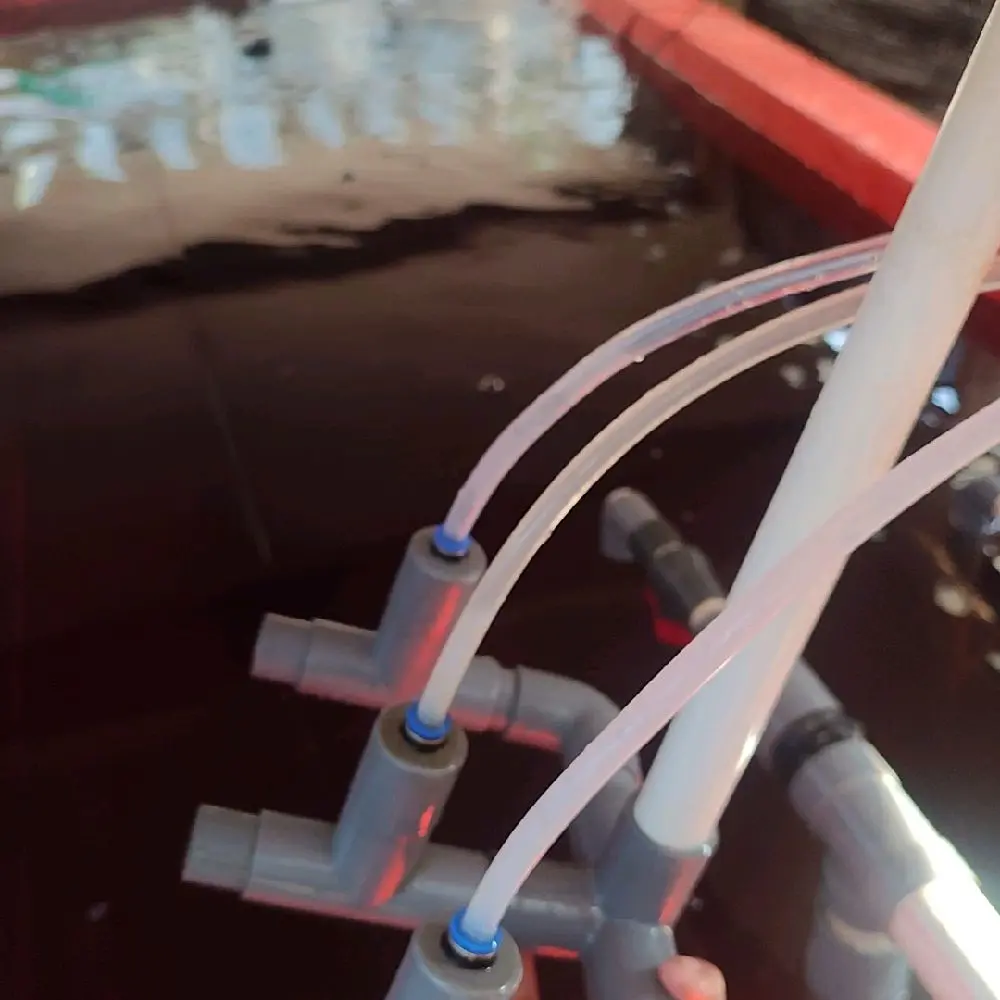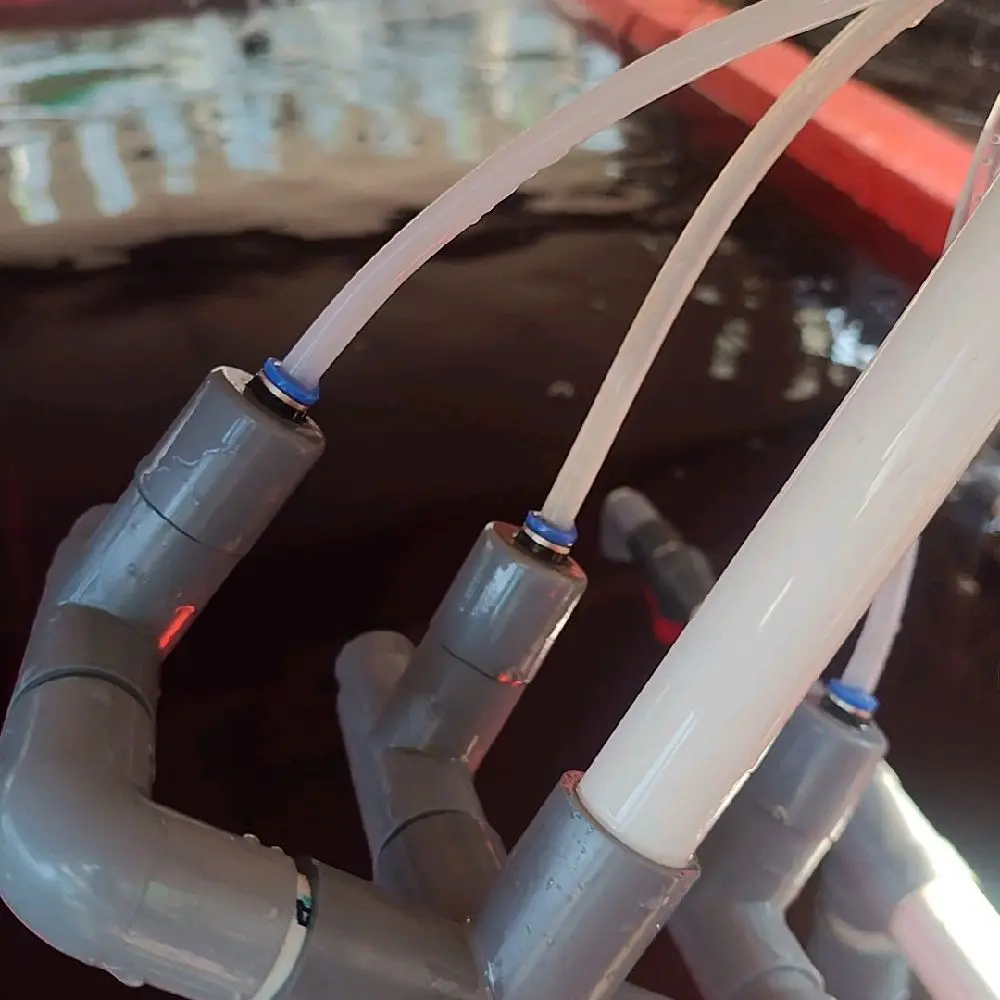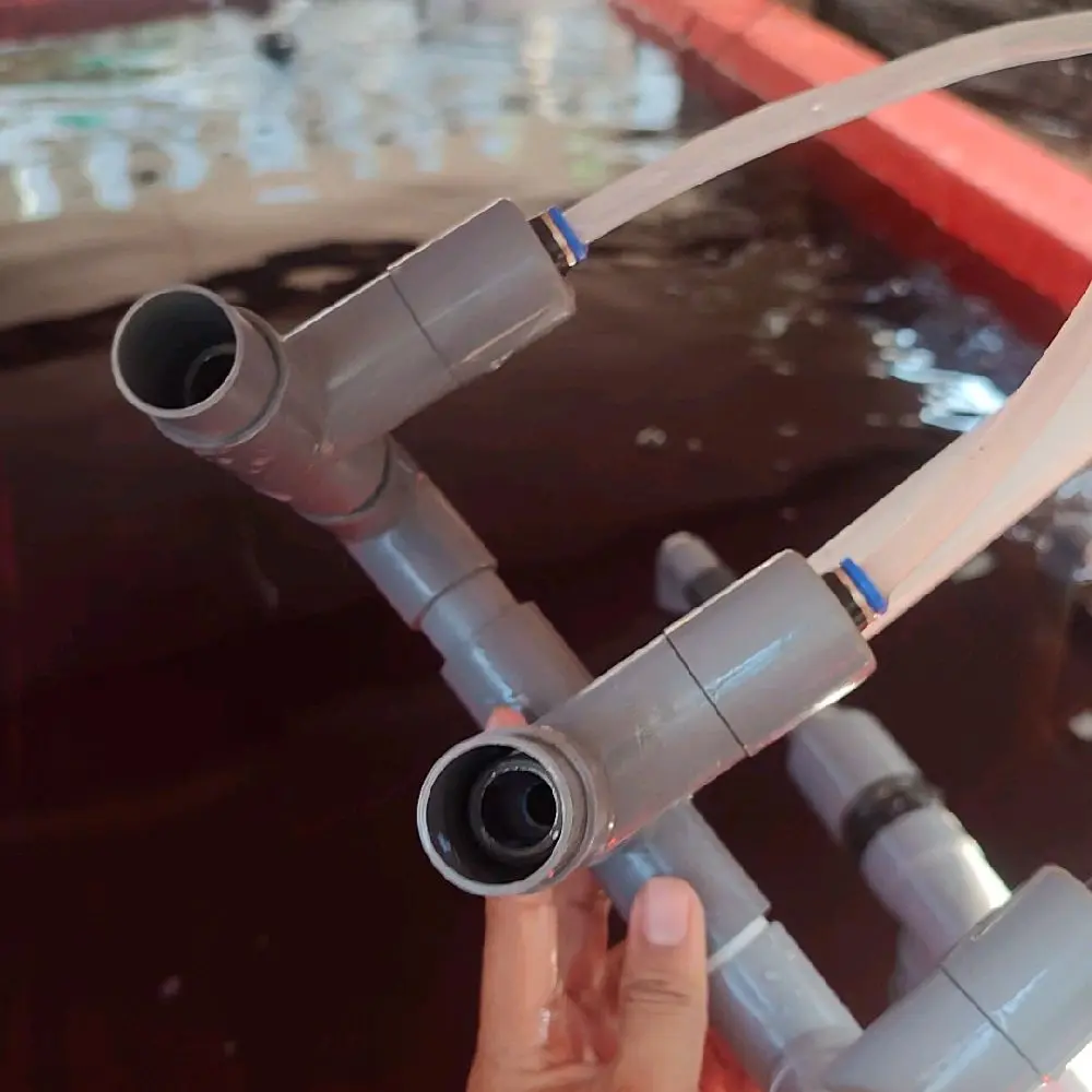 Venturi 3 cabang ini dirancang khusus untuk jet pump bertekanan tinggi, berfungsi menghasilkan hisapan udara kuat yang langsung tercampur ke aliran air. Terlihat pada pemasangan di tandon, venturi ini mampu menghasilkan gelembung udara aktif dan merata, menandakan oksigen terlarut meningkat dengan optimal.