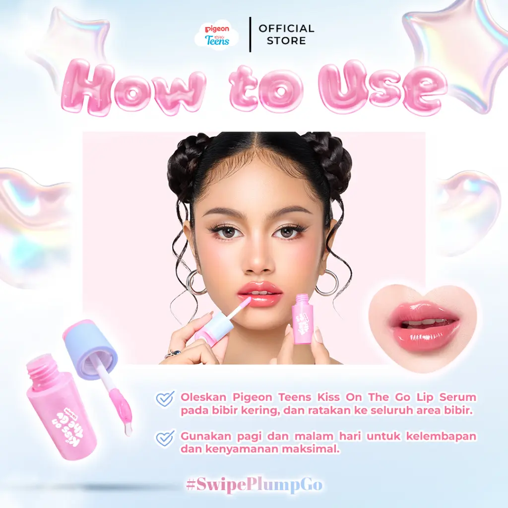 Aplikasikan Pigeon Teens Lip Serum secara merata pada permukaan bibir untuk memberikan hidrasi dan warna alami. Gunakan pada pagi dan malam hari.