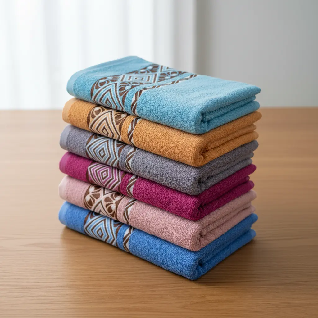 Setiap handuk memiliki warna solid dengan detail motif berwarna emas yang terlihat eksklusif. Cocok digunakan untuk rumah tangga, hotel, maupun sebagai hadiah.