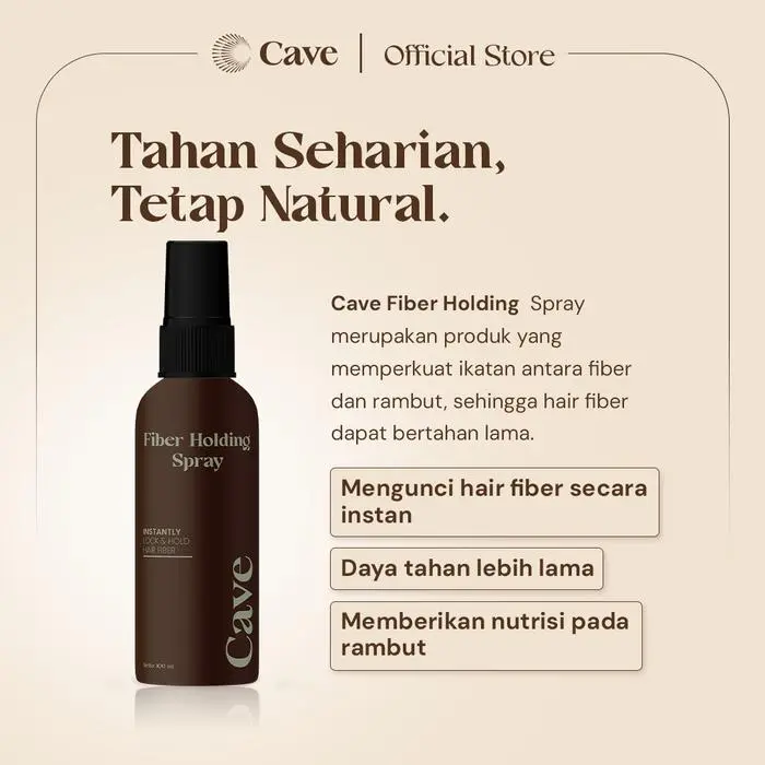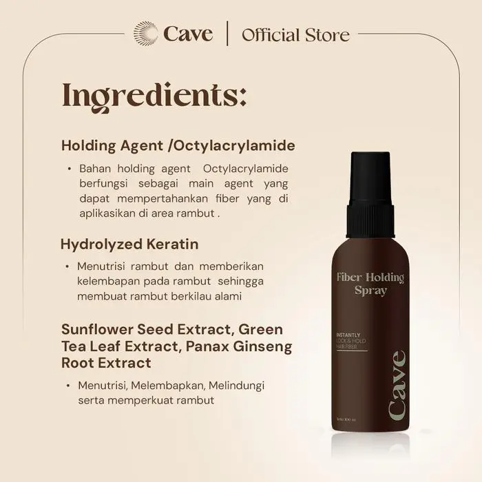 Cave Fiber Holding Spray merupakan produk yang memperkuat ikatan antara fiber dan rambut, sehingga hair fiber lebih bertahan lama dari paparan angin, hujan, dan keringat. Cave Fiber Holding Spray dengan Hydrolyzed Keratin yang dapat menutrisi, memberikan kelembapan pada rambut, dan membuat rambut tampak berkilau alami.