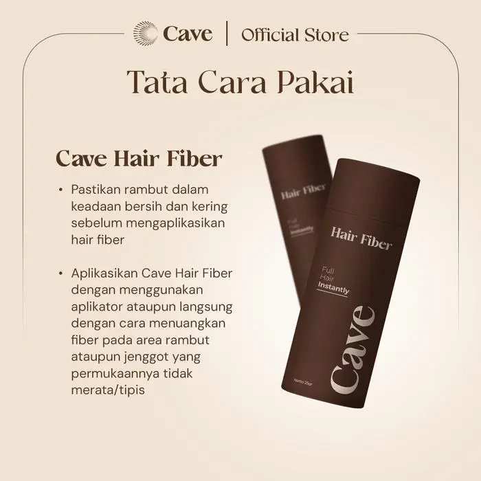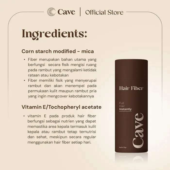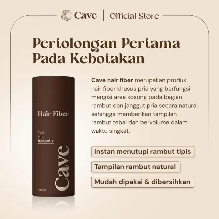 Cave Hair Fiber adalah produk hair fiber khusus pria yang berfungsi mengisi area kosong pada bagian rambut dan janggut pria. Cave Hair Fiber juga mengandung vitamin E yang dapat membantu memberikan nutrisi pada rambut pria. Cave Hair Fiber memberikan kesan natural tampilan rambut yang tebal dan bervolume seperti rambut asli hanya dalam waktu singkat.