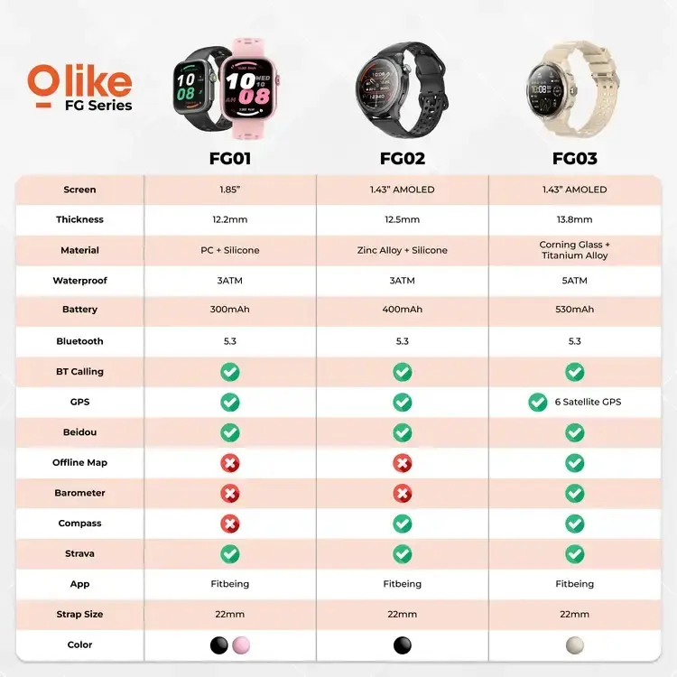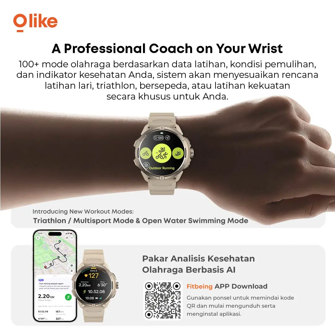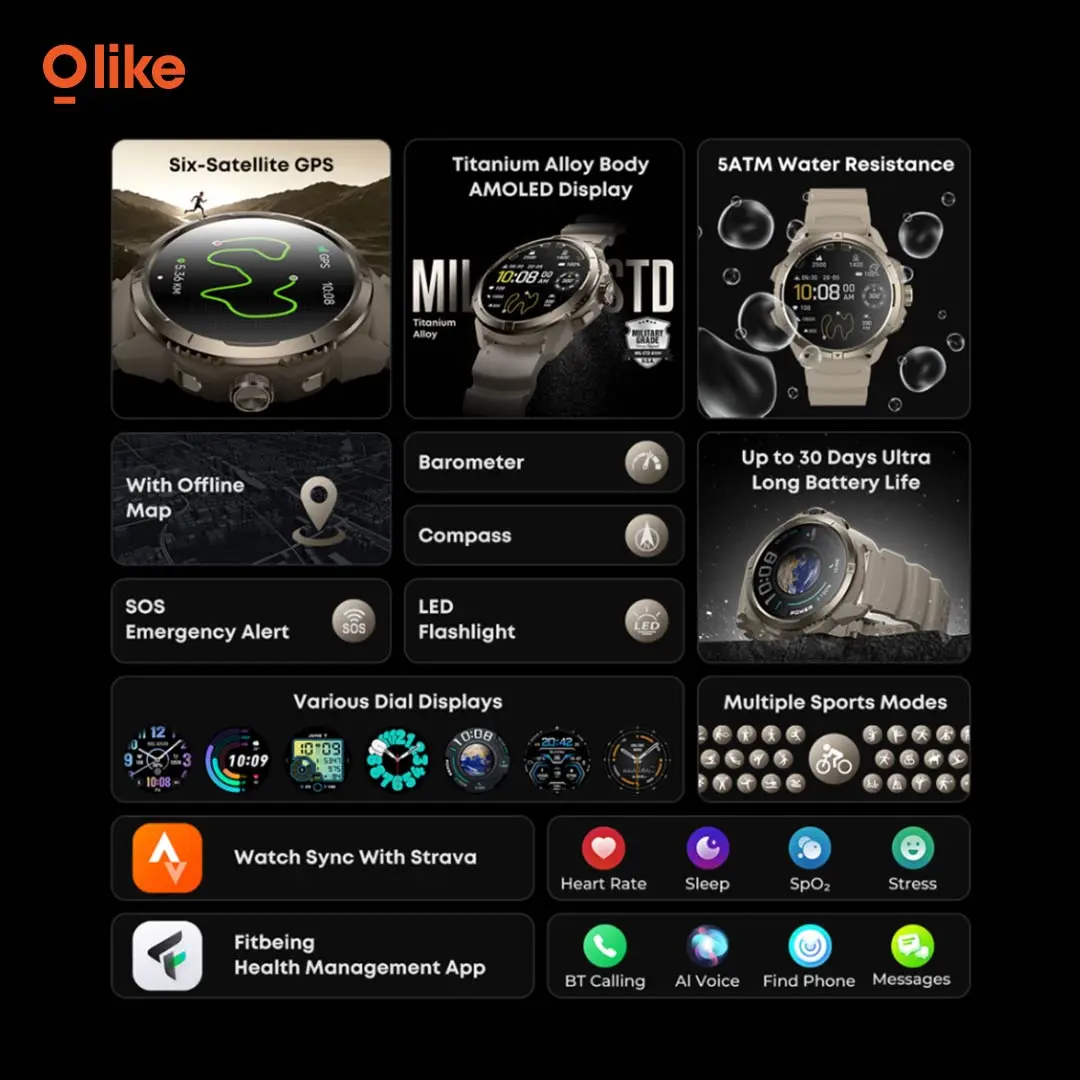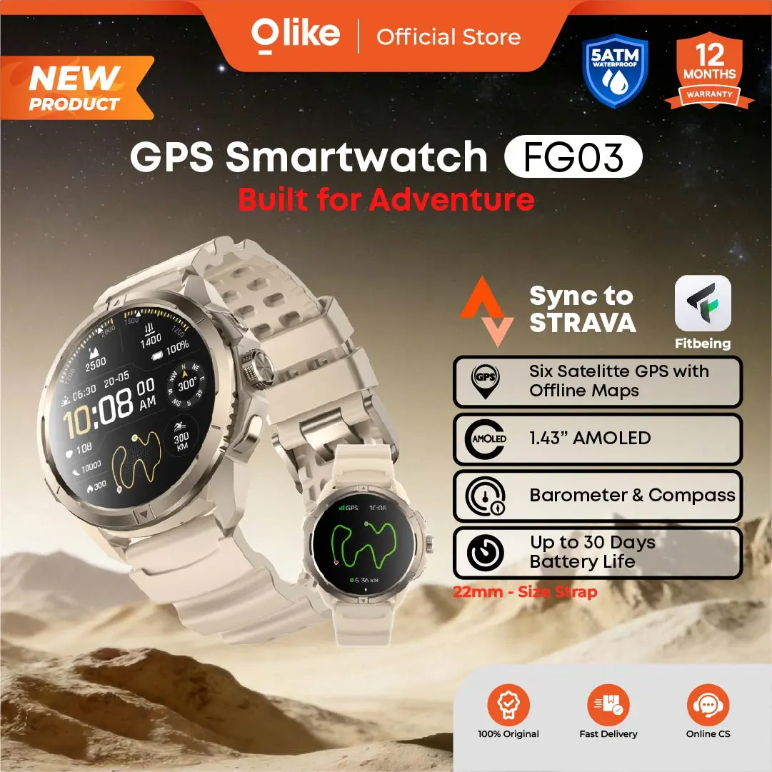 Olike Smartwatch FG03 - hadir dengan layar Amoled 1,43" dan 5ATM waterproof hingga kedalaman 50 meter. Smartwatch trendy dibuat untuk kamu yang serius di olahraga outdoor & eksplorasi.