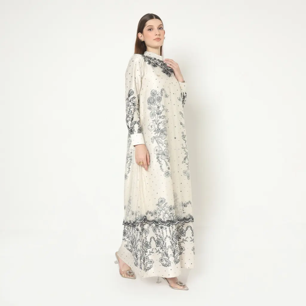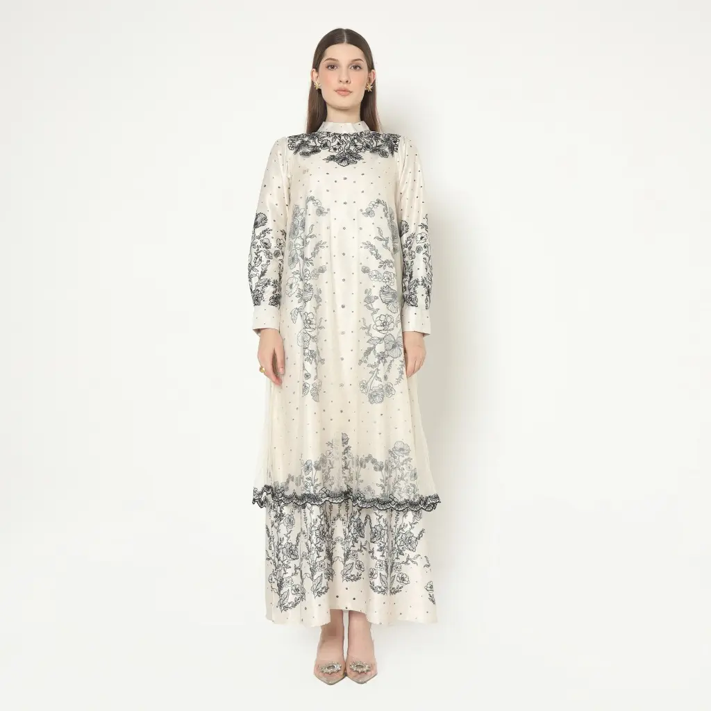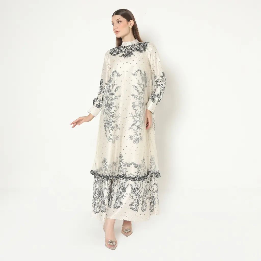 The Nahla Dress embodies timeless elegance with its flowing silhouette and intricate detailing. Crafted from luxurious, delicately embroidered fabric, it features a harmonious blend of subtle tones and ornate lace accents, creating a sophisticated and graceful appearance. The high neckline and long sleeves enhance its refined charm, while the layered design adds depth and movement. Perfect for both formal occasions and cultural festivities, the Nahla Dress exudes understated luxury, making it a stunning statement of classic beauty.