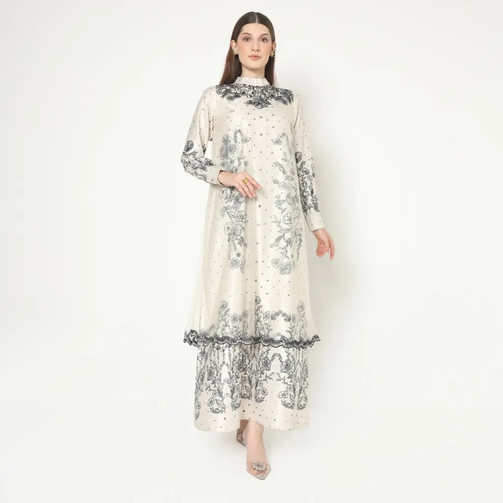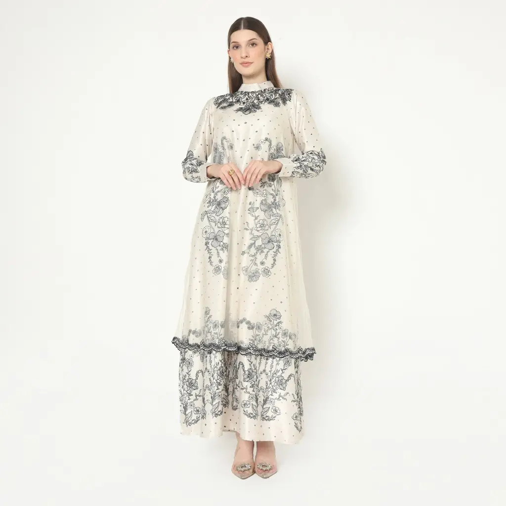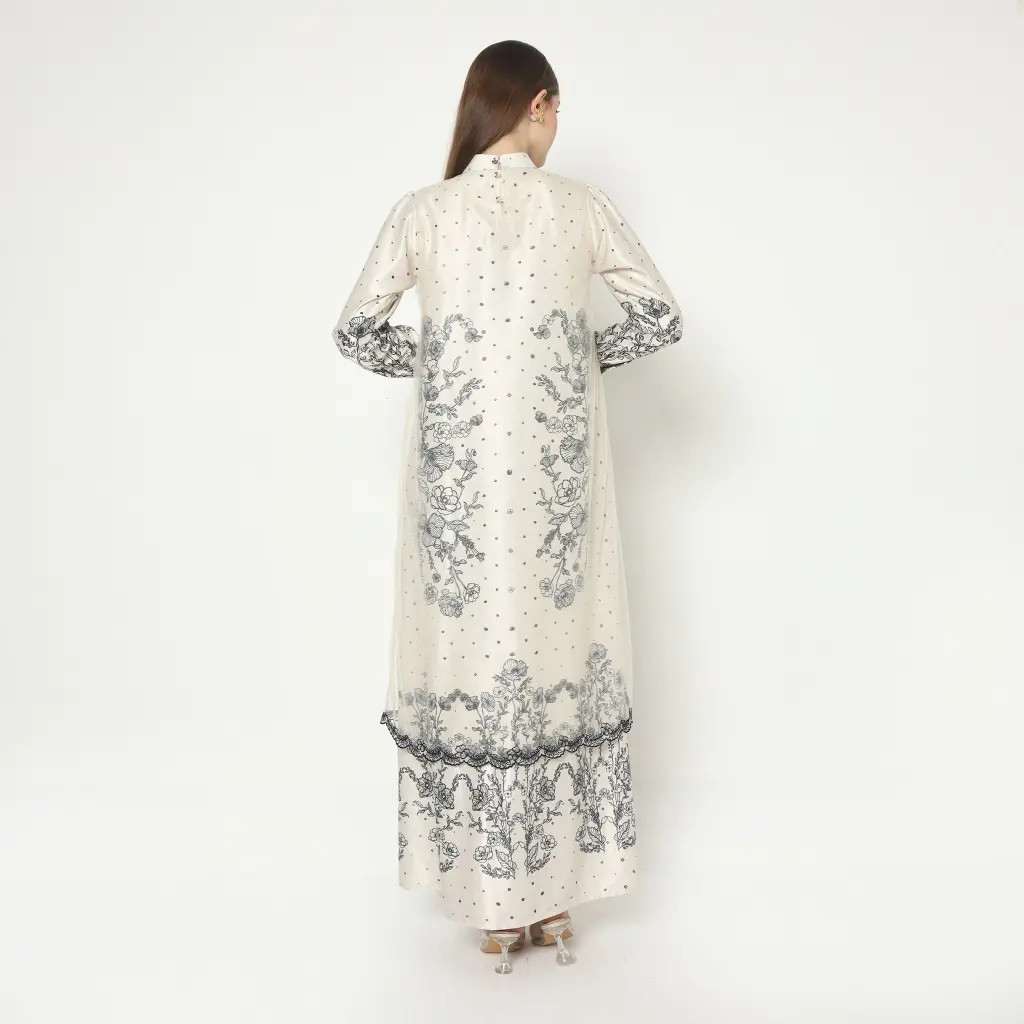 The Nahla Dress embodies timeless elegance with its flowing silhouette and intricate detailing. Crafted from luxurious, delicately embroidered fabric, it features a harmonious blend of subtle tones and ornate lace accents, creating a sophisticated and graceful appearance. The high neckline and long sleeves enhance its refined charm, while the layered design adds depth and movement. Perfect for both formal occasions and cultural festivities, the Nahla Dress exudes understated luxury, making it a stunning statement of classic beauty.