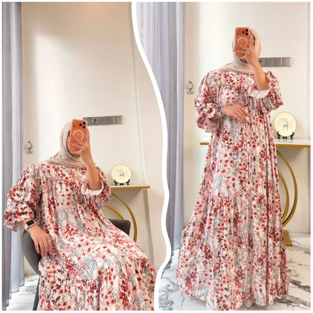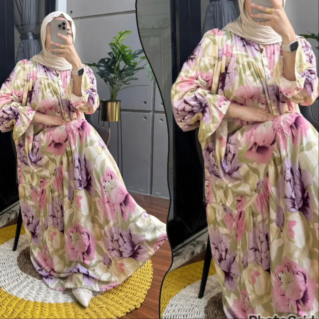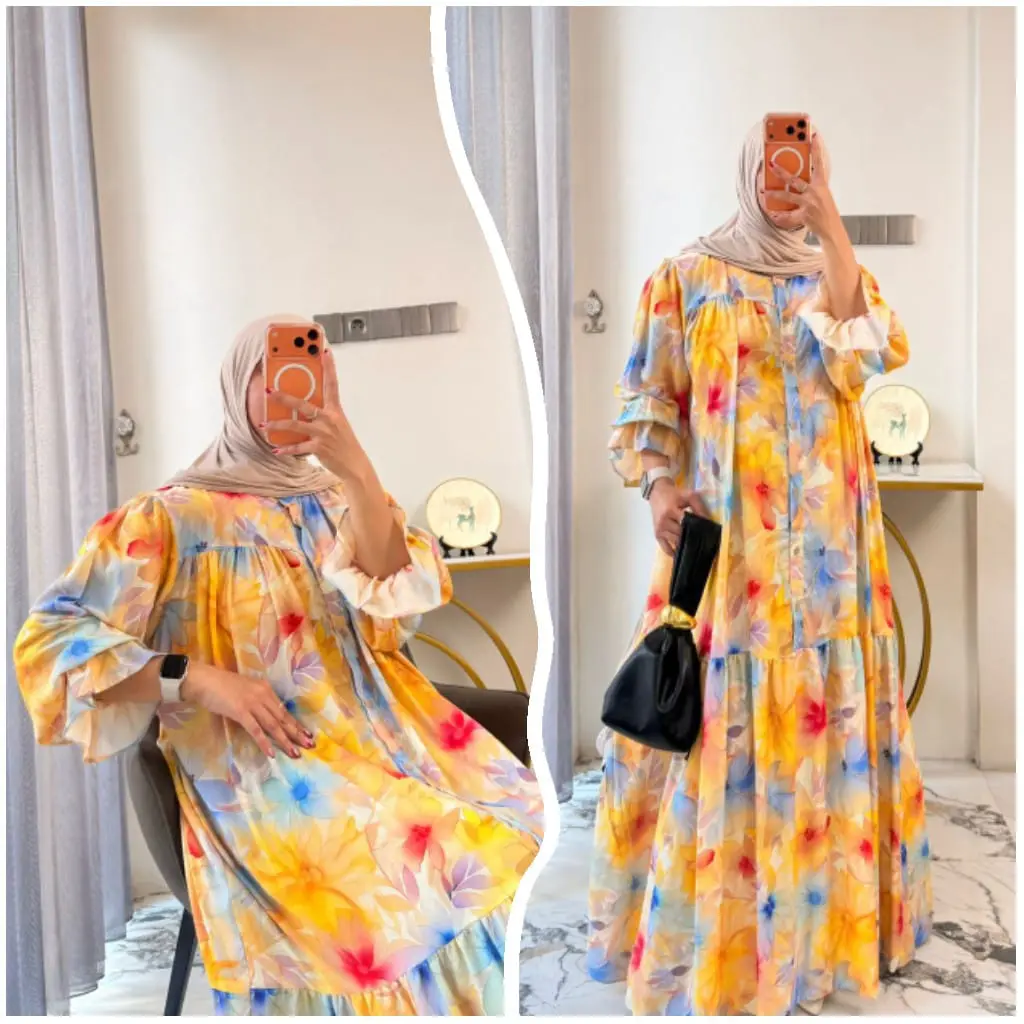 New Dres Leony Gamis Raya Series Lengan Ruffle Gamis Rayon Motif Daisy Gamis Muslimah Syari