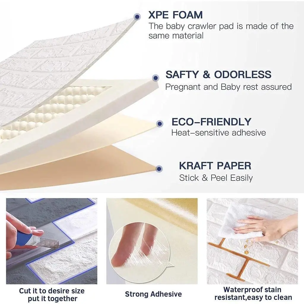 Walpaper dinding 3D foam bata dengan ketebalan 2.5mm. Ukuran bata: 70cm x 77cm. Bahan busa XPE, sangat ringan. Dengan lem super lengket dan tahan lama. Bahan dan lem ramah lingkungan. Kepadatan dan elastisitas tinggi, melindungi anak-anak dari benturan.