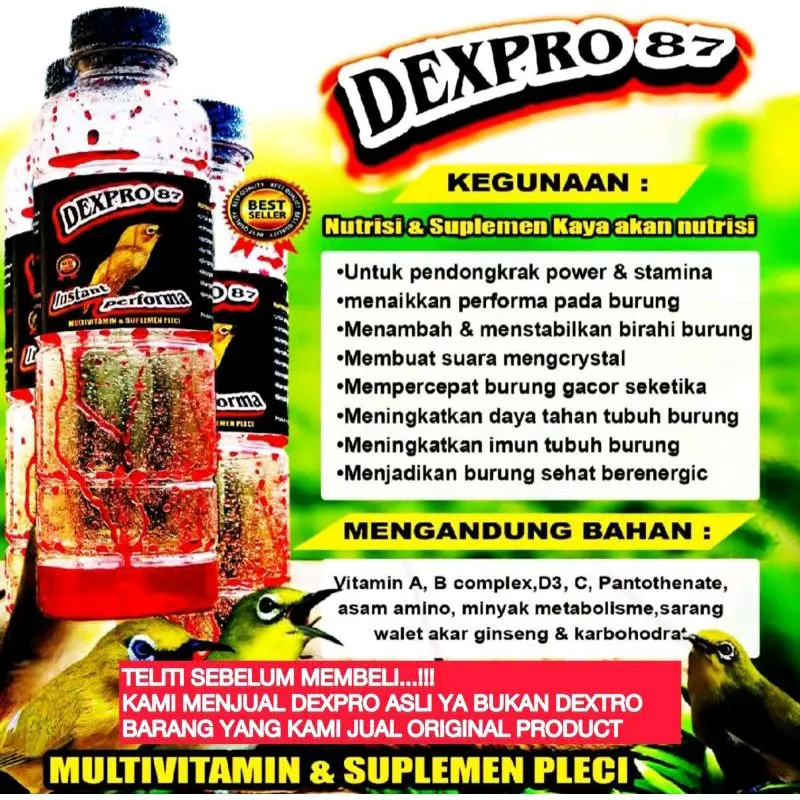 DEXPRO 87  MULTIVITAMIN & SUPLEMEN PLECI Teliti sebelum membeli Kami menjual produk dexpro 87 asli ya beda branded beda merk Bukan DEXTRO OM ACUS silahkan bisa diperbandingkan & dibedakan khasiatnya walaupun branded baru & harga murah  sangat berkualitas silahkan chek out trmksih Kegunaan : nutrisi & suplemen kaya akan nutrisi •Untuk pendongkrak power & stamina •menaikkan performa pada burung •Menambah & menstabilkan birahi burung •Membuat suara mengcrystal •Mempercepat burung gacor seketika •Meningkatkan daya tahan tubuh burung •Meningkatkan imun tubuh burung •Menjadikan burung sehat berenergic